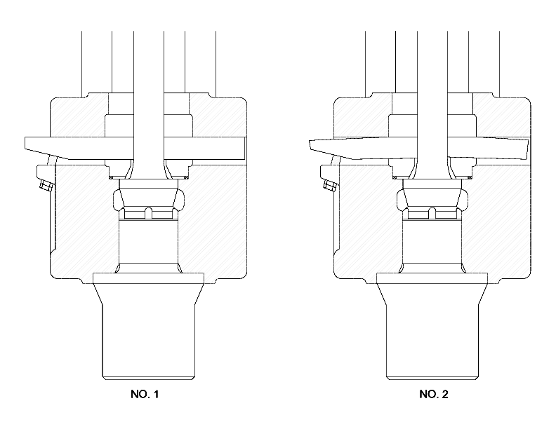 Sometimes it is difficult not to tighten the Ram Keys too much. Driven with a heavy weight a Ram Key can easily be driven so far as to bend. Figure No.1 shows a Ram Key properly seated. Figure No.2 shows a Ram Key driven too far and bent. The key is tight when it just starts to leave the seat at either end.