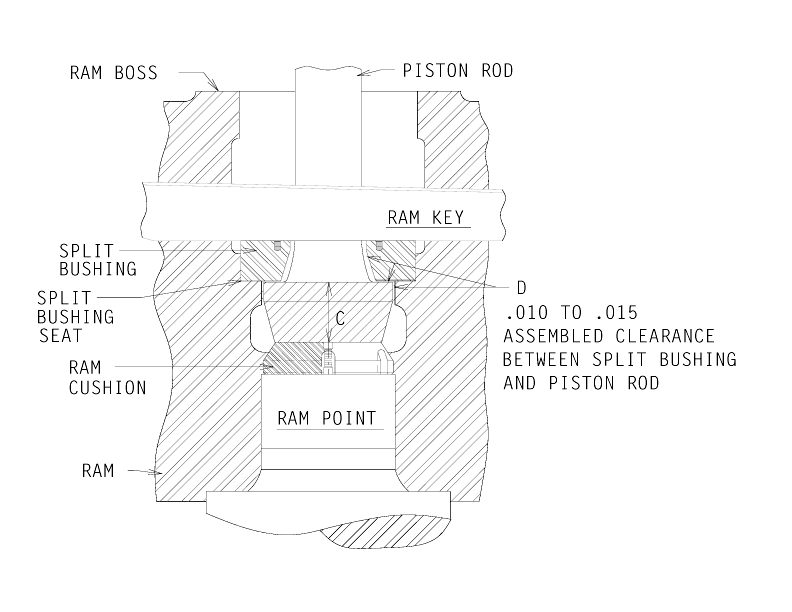 - The difference between these two dimensions is the distance between the Split Bushing seat and the top of the Ram Cushion. This distance should be .010″ to .015″ greater than the thickness of the flange at the lower end of the Piston Rod indicated by Letter C.