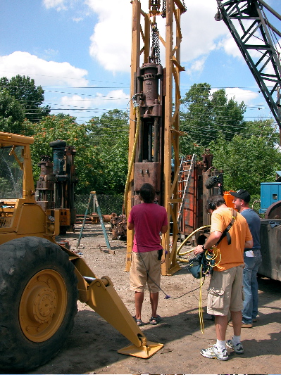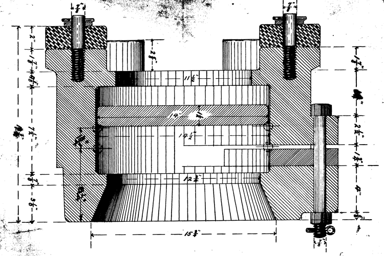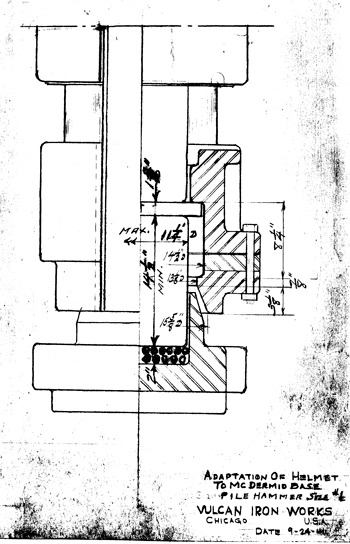 Note: the McDermid Base was one of the first “customisations” applied to a Vulcan hammer. Vulcan licensed this from its inventor, Hugh McDermid. Although the conical cone on Vulcan bases was originally designed to mate with tapered wood pile heads, the McDermid Base gave better alignment. This is one of the few instances where a Vulcan hammer could drive the pile “directly,” i.e., without cushion material. Unfortunately hammers equipped with a McDermid Base could only drive wood piles, thus without adaptations such as this such a hammer was limited in its scope.