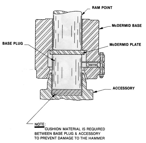 We do not recommend the use of McDermid base for any type of pile other than wood. But on occasion, contractors have found themselves in a position whom they have had to adapt a McDermid base to standard Driving Heads or Pipe Caps. The above shows the arrangement necessary to accomplish this.