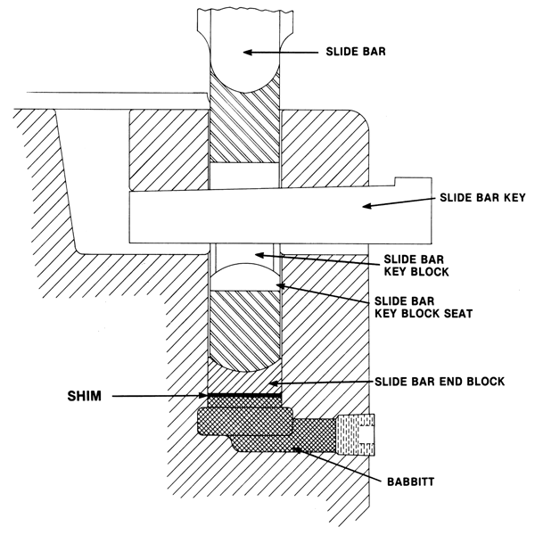 When checking the position of the Slide Bar (as shown in Vulcan Tip No. 2) if you find it below the correct position, add the Shim BELOW THE SLIDE BAR END BLOCK, as shown above. Shims installed under the Slide Bar, for obvious reasons, will create problems.