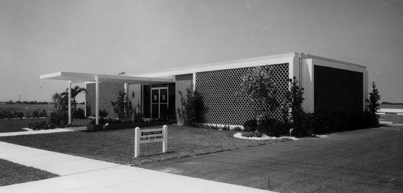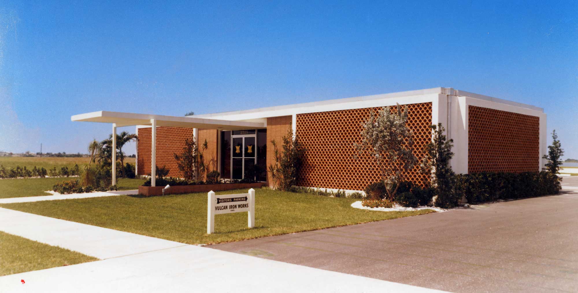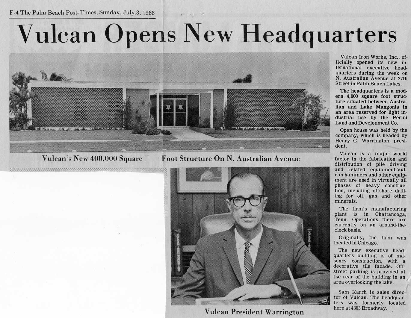 Vulcan relocated its executive offices to West Palm Beach, Florida, in June 1964. To begin with they rented space at 4303 Broadway Avenue in West Palm Beach. Two years later, in late June 1966, Vulcan opened its own office at 2725 N. Australian Avenue, West Palm Beach. The architect who designed the office was Robert H. Braido.
