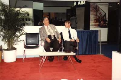 OTC reached its zenith in 1982 with over 100,000 in attendance, but the collapse of oil prices led to the collapse of the show’s attendance as well. Vulcan’s participation as an exhibitor was erratic during those years, but had one unique feature: the presentation of two technical papers by a Vulcan employee, in this case Don Warrington’s “A Proposal for a Simplified Model for the Determination of Dynamic Loads and Stresses During Pile Driving” in 1987 and “Theory and Development of Vibratory Pile Driving Equipment.” in 1989.OTC attendance, 1969-2005. Source: Offshore Technology Conference.The appointment of Dave Horsman as President of Vulcan in 1991 marked the return of Vulcan to OTC on a regular basis. Here he’s shown (on the right) “manning the booth” at the 1994 OTC. The photo also shows the last booth Vulcan built for OTC.