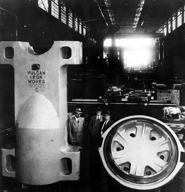 From the most “retro” part of the product line, the shape of things to come: a large (57,260 lb.) drop hammer with its 24,100 lb. pipe cap for driving 72″ pipe piles at the Blaw-Knox foundry in East Chicago, IN. The photo dates from around 1950. Between the hammer and the cap is a Blaw-Knox official, Water Daspit, Vulcan’s treasurer, and Campbell V. “Doc” Adams, Vulcan’s chief engineer. An Australian immigrant, his initials first appeared on a drawing in 1912; his last regular production hammer was the offshore 060 in the late 1960’s. His designs dominated Vulcan’s product line for much of the twentieth century. With this drop hammer, Vulcan’s product line had outgrown its production facility, a problem the company would face once again during the offshore years of the 1960’s and 1970’s. Blaw-Knox would, in fact, play a role there too, manufacturing most of the Vulcan 5150 and 6300 hammers for Vulcan.