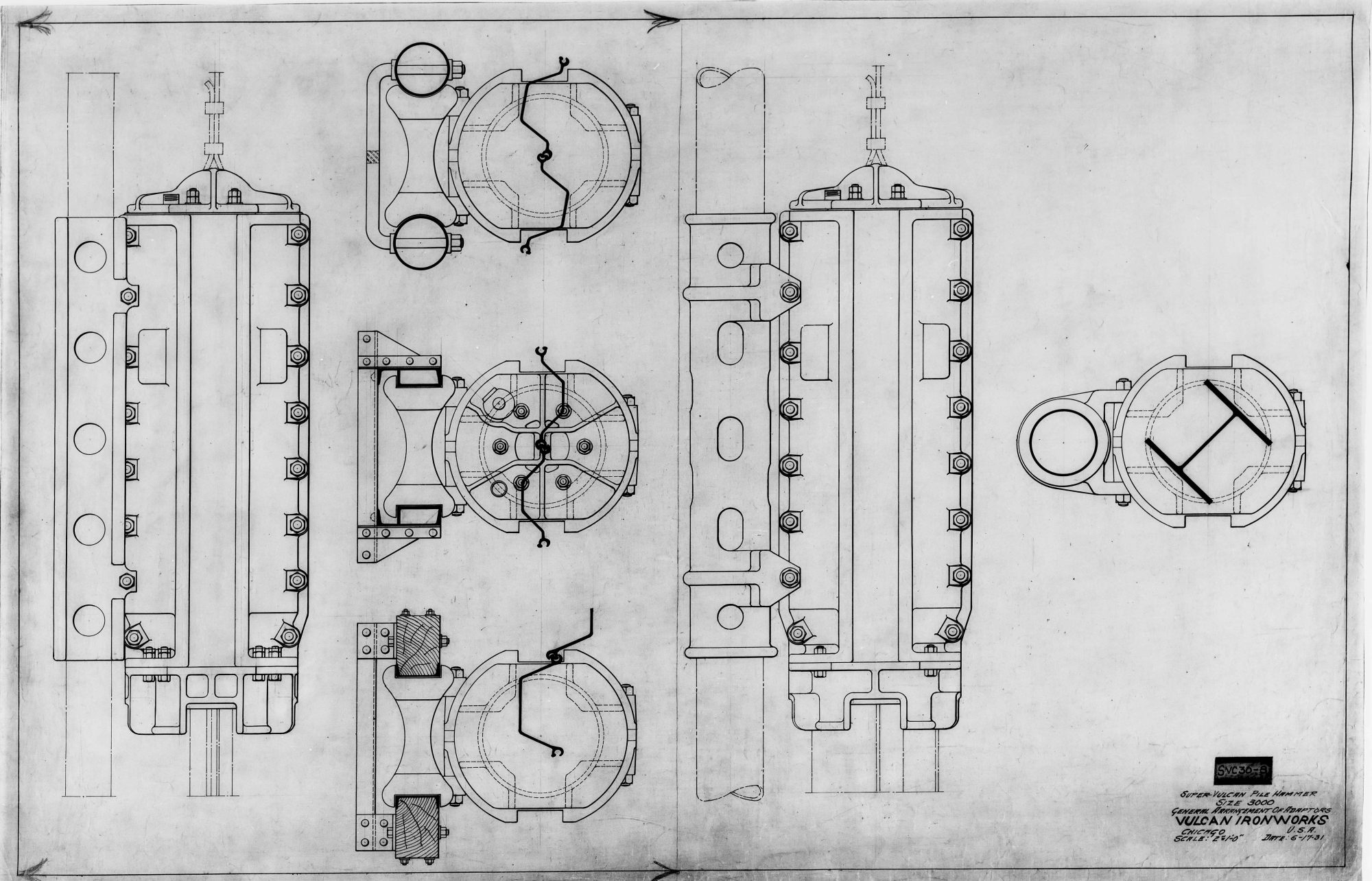 Beyond that, the open hammers, Vulcan’s “signature” so to speak, had one key advantage: one could see the ram stroke, which was another method of verifying the energy output of the hammer during operation. In addition to putting piles in the ground, impact pile drivers were (and are) used as a measuring tool to verify the load capacity of the pile, which is problematic if one doesn’t know the energy output of the hammer. Open hammers are also easier to maintain because the working parts are easily accessible, a major advantage to the contractor.