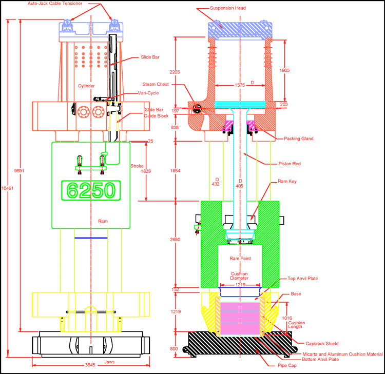Vulcan had plans to directly incorporate cable versions of all of these hammers, but ultimately developed 5′ stroke versions of them, incorporating Raymond features both from existing Raymond hammers and from those which they were unable to bring to reality. The “flagship” of this line was the 525, featured at the right. It was a 5′ stroke version of the 8/0, albeit with a single piece ram. It would have incorporated a 125 ft-kip hammer into a 37 kip machine.