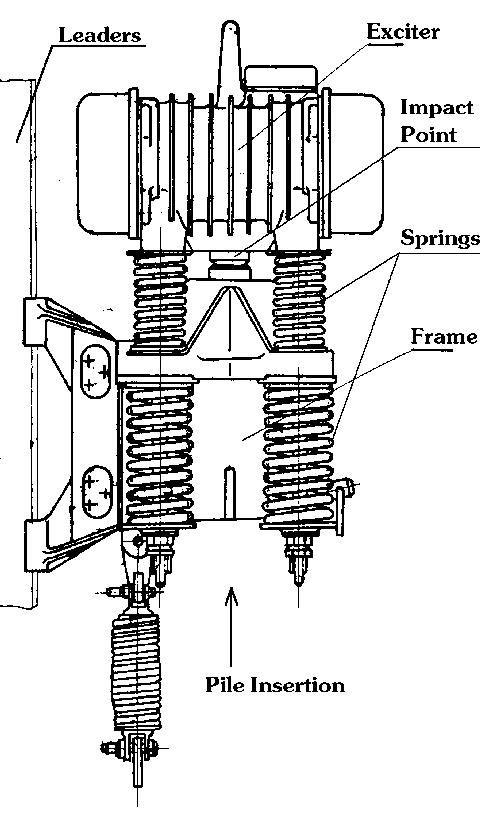Impact-vibration hammers are categorized according to the way in which the frame is connected to the pile. With these machines, a secure connection to the pile enables the machine to use the exciter to push and pull against the pile, thus using the pile to anchor the machine. A frame which is rests unconstrained on the pile has the possibility of moving in the direction of the exciter during operation. To deal with this, the frame’s weight is chosen with the potential force of the exciter springs in mind. If the frame weight is greater than the force of the springs, the frame will not move and thus provide a stable work environment for the exciter.