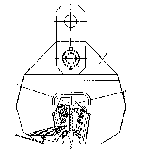 When the clamp is lowered onto the pile top, the jaws are moved upward until the ledge (4) rests firmly on the pile top. The springs force the jaws into the sides of the pile web; when the hammer is started the jaws are tightened on the pile. This connection is tighter than the cam type. When extraction is complete, the hammer is lowered and the jaws release themselves.