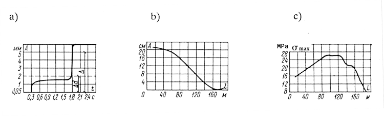 Fig. 12 shows the results of calculations for the vibrational extraction of a string 200 m long embedded 100 m deep into the ground. The zone of ground elasticity on the lateral surface is taken as 0.2 cm, and for breakout to occur on each section the amplitude of the vibrations should exceed a value of A = 0.5 cm. It is evident from Fig. 12 (a) that the bottom butt end of the pile began to move relative to the ground 1.84 seconds after vibrational extraction began. Fig 12 (a) shows the change in the amplitude of the vibrations at the lower butt end in the initial stage of vibrational extraction. There is an abrupt increase in the amplitude of vibrations at the moment of breakout. The damping of the vibrations along the string for this variant is shown in Fig. 12 (b). The amplitude of the vibrations of the free-standing, upper butt end exceeds the amplitude of the lower butt end by a factor of more than 35. Fig. 12 (c) shows the distribution of the maximum level of tension achieved along the length of the string during the vibrational extraction process. Like the amplitude of the vibrations, they are highly nonuniform along the length of the string and reach a maximum just below the beginning of the restraint holding the string of casings in the ground.