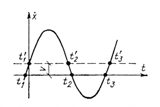 If the element be taken to have a mean speed of advancement v in addition to its oscillatory motion, then, when v is positive, the graph of its speed (see Fig. 8) shifts upward a distance equal to v. On the new speed graph, the element moves upward during interval t1-t2 and downward during interval t2-t3 By now the intervals t1-t2 and t2-t3 in which the element rises and falls, are no longer equal, and hence the friction pulse over the course of a period is other than zero.