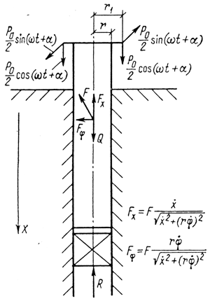 The diagram used in calculating for longitudinal and rotational oscillations is shown in Figure 14. In developing the mathematical model, the same assumptions were used as were used for a sinking process utilizing longitudinal oscillations. The vibrational sinking process corresponding to the calculation diagram in Figure 14 can be presented in the form of a piecewise system with the following stages: