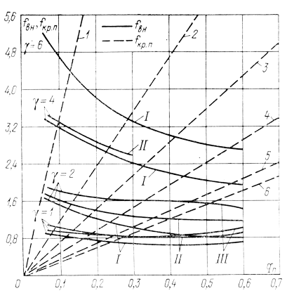 The characteristic graphs reflecting the dependence of the maximum value of the force fBH acting on the tube-soil core contact on the parameters of vibration driving of tubular elements and the soil re sistance with the dimensionless generalized characteristic x = 100w2D/g =1.2, sKP = 30 kPa and p = 2 t/m3, are given in Figure 65.