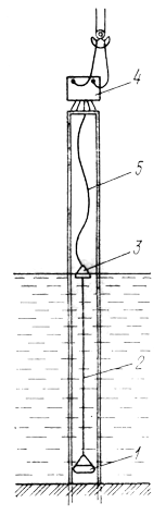 The apparatus (Figure 68) consists of a shock absorber suspended on a cable to a float. The length of the cable is selected so that the shock absorber hangs on the float close to the bottom. The entire apparatus is suspended to the head of the vibrodriver on cables and is introduced inside the pile when the vibrodriver is set up [21].