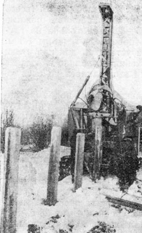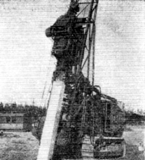 The device (Figure 59) was operated in the construction of the guard rails for the Oktyabr railroad (a total of 6000 posts were driven). With the vibration mode, the post was driven in 2.5-30 minutes only to a depth of 0.7-0.8 m, and with the impact mode, to the projected depth of 1.3 m. The use of part of the mass of the pile-driving apparatus for driving the post during its vibrational-impact installation permitted a reduction in the driving time to 1-1.5 minutes. The work was performed according to the following technology: