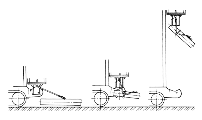 The pile is placed in the head of the impact-vibration hammer in the following order (Figure 58). The gripping frame is placed over the top of the pile and a pintle with a fast-acting fastener is inserted. The frame is held with a chain for longitudinal transfer during the lifting of the pile. Due to the fact that the frame is connected with two measuring cables to the head, during the raising of the impact-vibration hammer the pile passes from the horizontal position to a vertical one and gradually enters the cavity of the head. After the lower end is pulled away from the ground, it hangs in the cables in the vertical position and due to the eccentric suspension of the frame the pile is fixed into the front cavity of the head. When the impact-vibration hammer is lowered, the pile is fixed in the internal cavity of the head when it reaches the ground with its lower end.