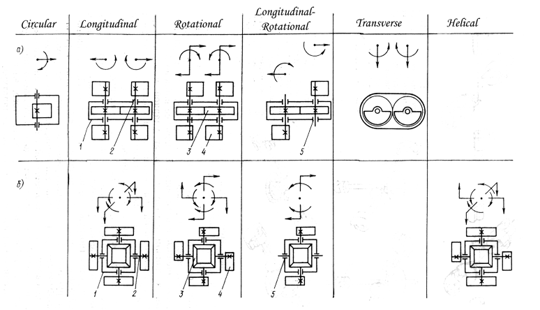 With respect to the longitudinal axis of the element to be driven (extracted), the vibration exciters used in pile-driving and drilling vibration technology are capable of exciting circular, longitudinal, rotational, longitudinal-rotational, transverse and helical vibrations. Various kinematic schemes of eccentric vibration exciters that generate the said forms of vibrations and their combinations are shown in Figure 41. These schemes assume a perpendicular disposition of the longitudinal axis of the element to be driven (extracted) to the plane of the drawing.