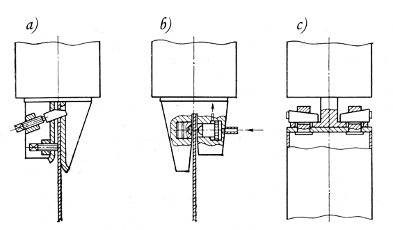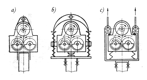 The VPP-2A vibrating drivers and their modifications are designed according to the scheme of Figure 45c with spring-mounted load, the VSh-1 vibrating apparatus is a vibrating machine with a combined action and is capable of operating in the vibration and in various impact-vibration modes (single-impact and dual-impact, as in pile driving and in its extraction) /45/. These vibrating machines are supplemented with heads according to the schemes of Figure 53a or Figure 54b.
