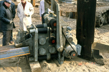We were met there by a delegation from the Organization, which first took us to the Moscow Hotel where we got a room and prepared for the day. Included in the delegation were E.A. Narozhnitskii, (Director) and M.L. Pevzner of the Leningrad Experimental Factory of Construction Machinery. We then went to a jobsite in Leningard, where they were building a tunnel under the river. They had been working on this project for a year and had managed to drive some sheet piling. Their vibratory hammer was driving some Laarsen sections about 24m in length, which they did using their vibratory hammer. On the vibratory, an electric motor mounted in the suspension plate on top of the hammer and a chain drive system extending from the suspension to the gearbox. The clamp is able to drive only one sheet at a time. The hammer is electric, about the eccentric moment of the 1150 but with about half of the power. The power comes from the electric power grid (that is to say, they plug it in somewhere), and they have a control box to provide the necessary circuitry to start and stop the 3-phase motors. In spite of the potential to gear up or down, the electric motor and eccentrics both rotate at1500 rpm, and they have other models that are slower. It took them about 5-10 minutes through the glacial till they were driving through. The hammer is quiet though and, without the power pack, the noise was limited.