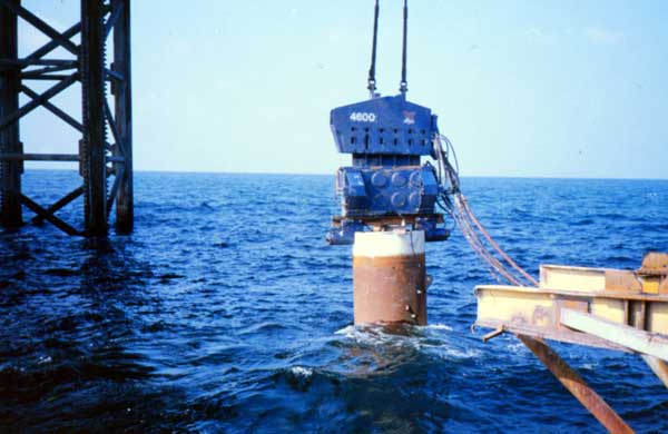 A Vulcan 4600 driving a caisson for Subsurface Contractors of St. Louis, MO. Driving caissons was and is a major application for vibratory hammers, a marriage from a construction point of view of driven piles and drilled shafts.