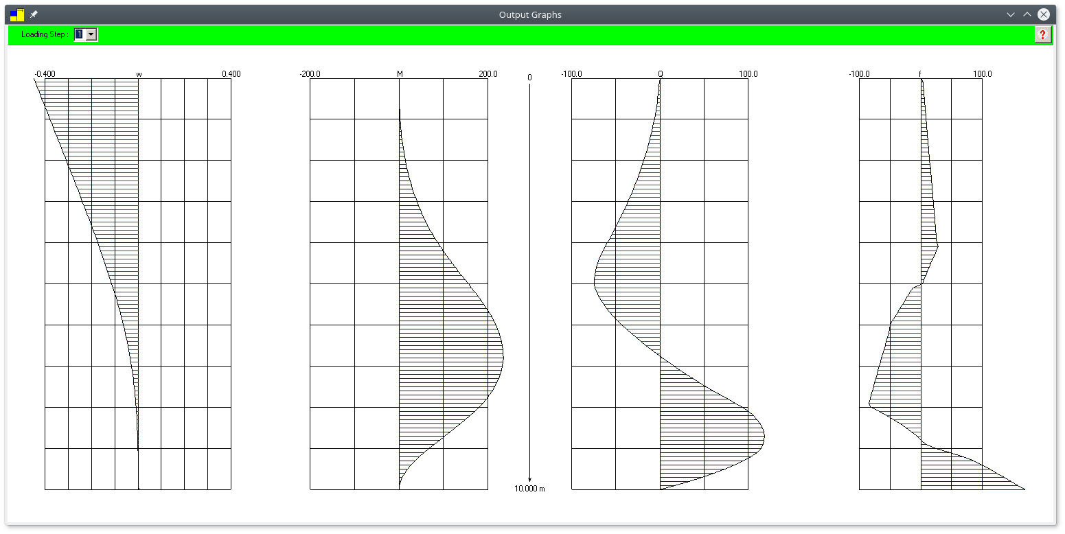Now we select a sheeting length and a profile. We’ll select a length of 10 m (you will need to iterate from a short length, perhaps 6m and go upwards until you get a result that does not produce an error.) We’ll also start by assuming Profile #1 (Hoesch 95.) Running this yields the following beam diagrams: