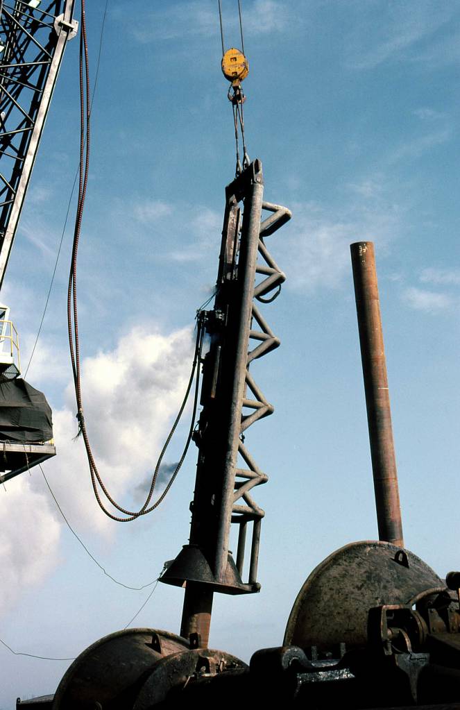 The hammer was finally completed on 11 June 1975, but there was another twist: it was assembled on the deck of McDermott’s Derrick Barge 8 in Bayou Boeuf, Louisiana. Vulcan traditionally preferred to ship their hammers assembled, but freight and delivery issues forced this method. It was successful, not only making it simpler to ship the heavy hammer parts in pieces, but also to familiarize the end user’s personnel with the hammer itself. By the 1990’s it became the standard method of delivery for hammers going to the Gulf of Mexico.