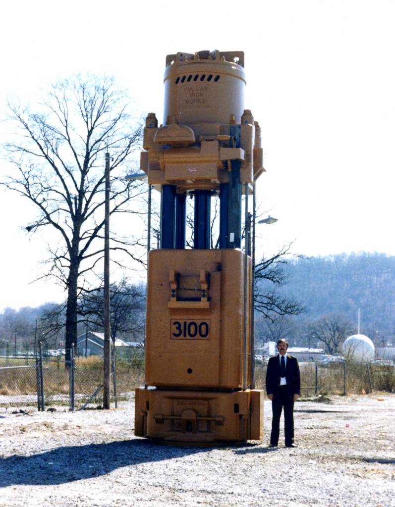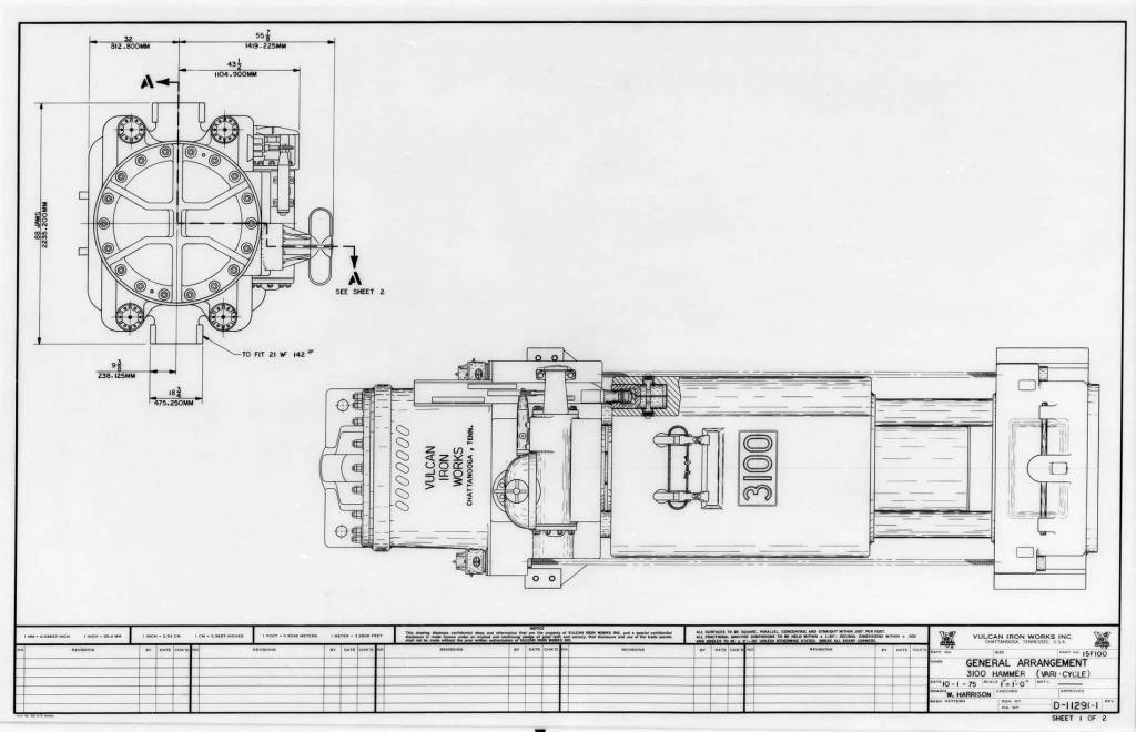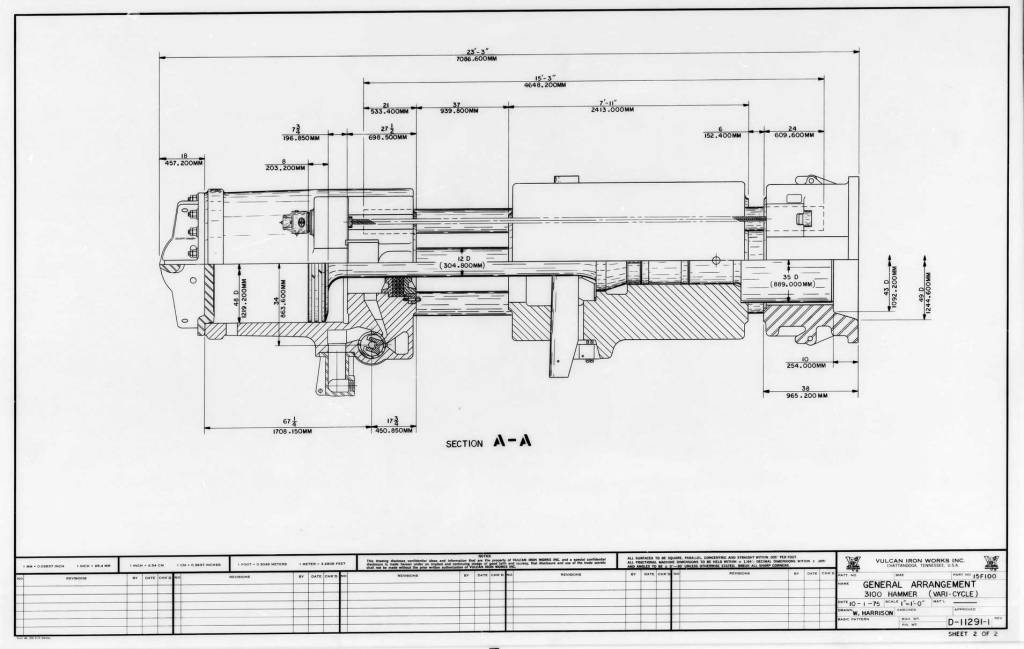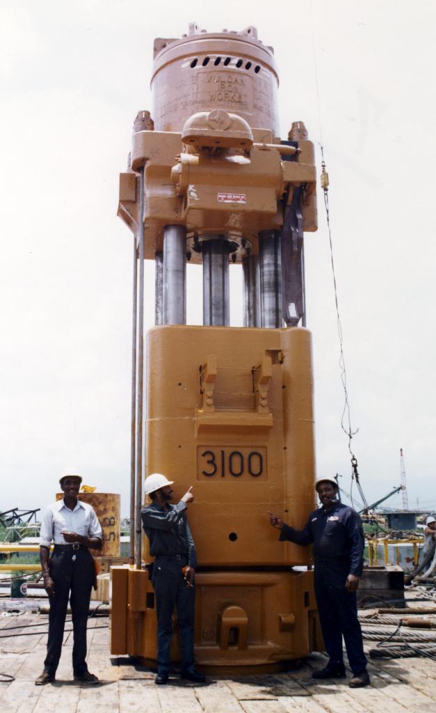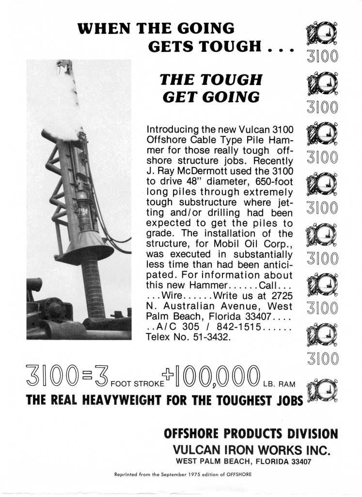 The first 3100 was built for McDermott. Even though the 560 had been introduced earlier and was lighter for the same energy, McDermott felt that the traditional “heavy ram-low striking velocity” approach was better, and also had the crane capacity to handle this size of hammer. The hammer was ordered in the fall of 1973.