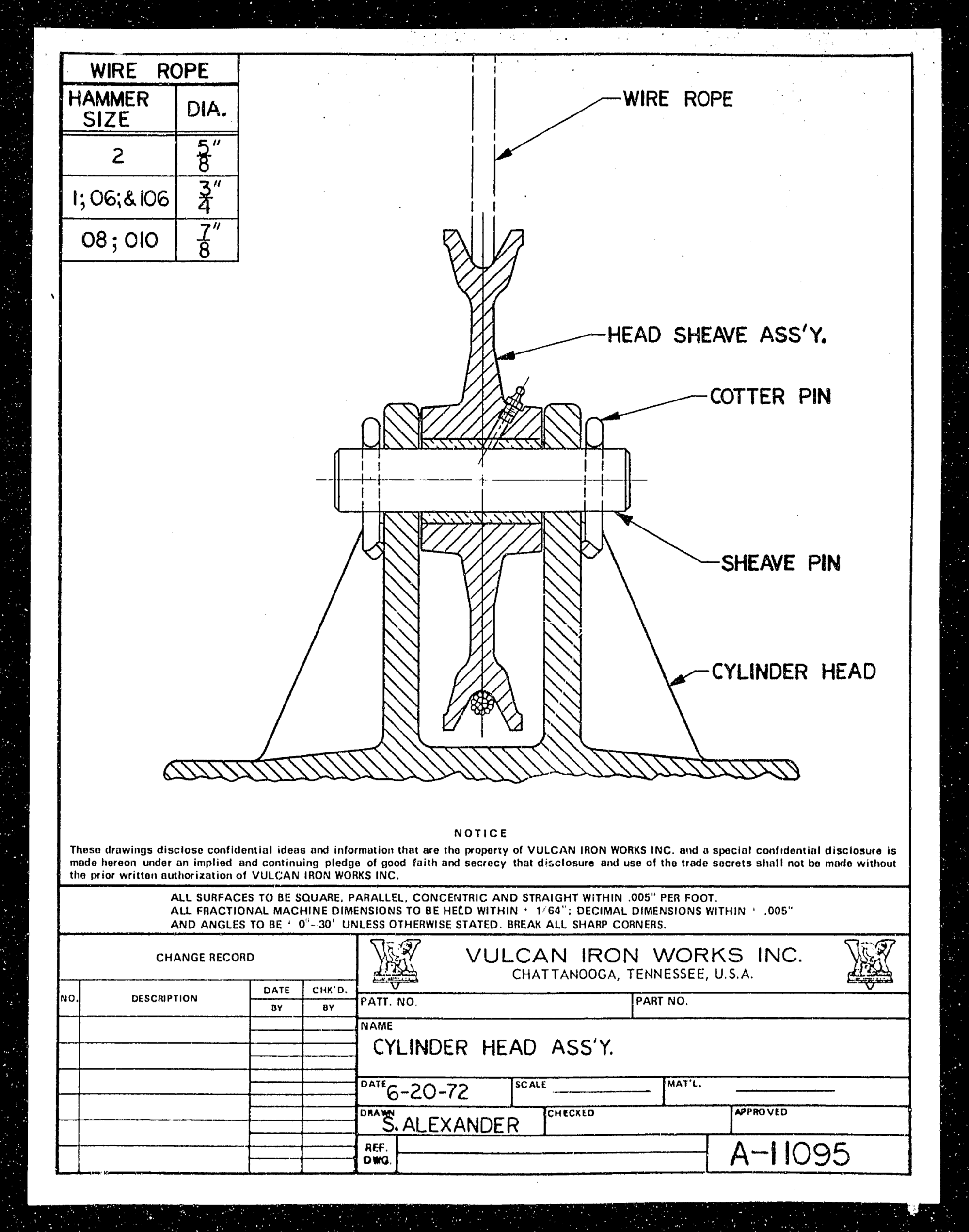 Above is a Vulcan diagram of the sheave and cylinder head assembly for Vulcan #2, #1 and #0 series hammers, which include the 06, 505, 506, 0R, 08, 010, 012, 508, 510 and 512 hammers. It includes the factory intended wire rope sizes for these hammers. Some additional notes are as follows: