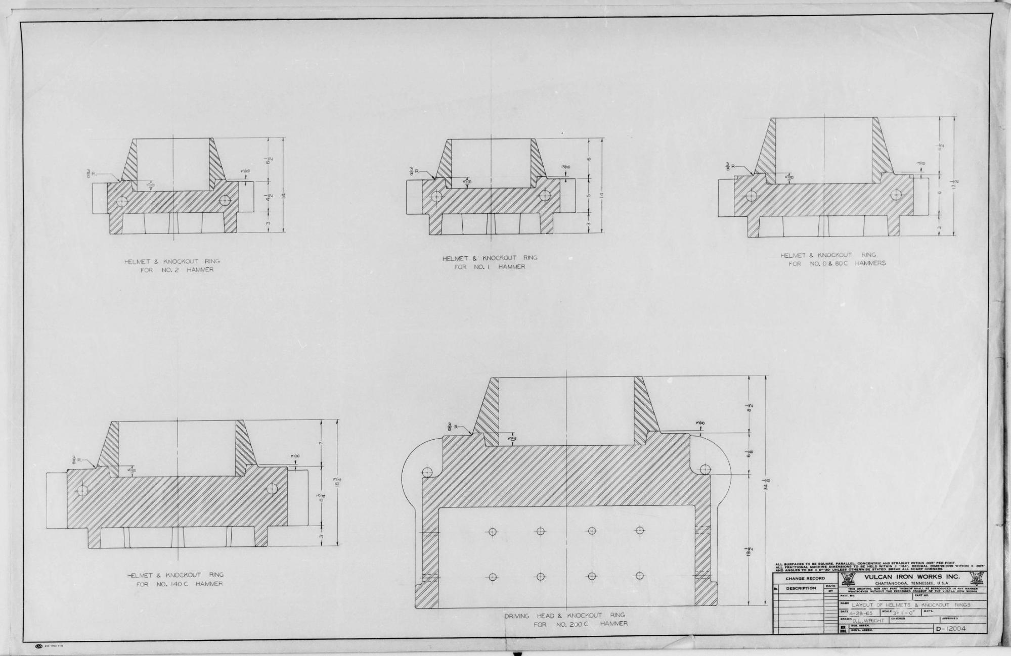 Above is a chart from 1965 of knockout rings for Vulcan hammers from the #2 to the 020/200C series. The knockout ring is, in some way, a short version of the capblock follower/shield for softer cushion materials. It replaces the integral ring which has been standard on Vulcan hammers. (Some explanation of both is here.) Vulcan’s literature from the 1970’s explained it in this way: