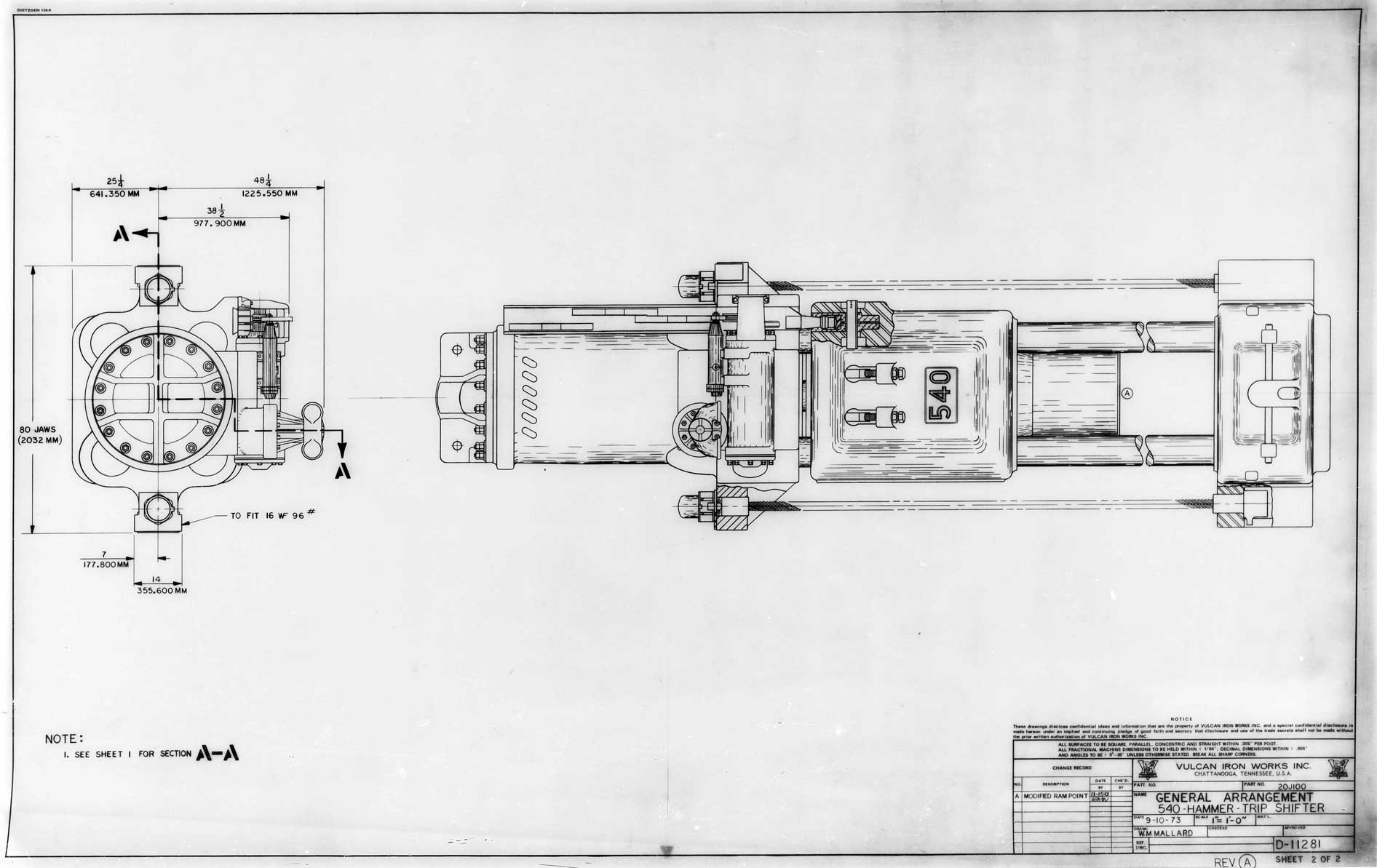 With the success of the first 5′ stroke hammer, the 560, Vulcan proceeded to do the same to its successful 040/340 hammers with the 540. The first 540 was produced and sold to Conmaco and delivered in 1974. Specifications are below.