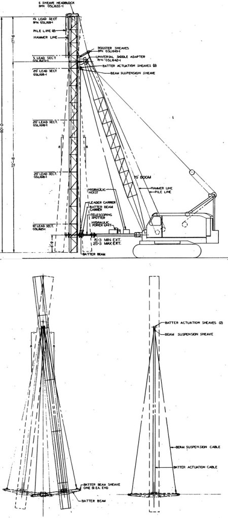 Vulcan had adhered to the “heavy stroke/low striking velocity” concept since the beginning, but by the early 1970’s the “race to the top” for hammer size–driven by the larger and deeper conventional platforms–was getting ahead of the barge capabilities of Vulcan’s largest customers. In the Gulf of Mexico that principally meant McDermott and Brown and Root, but also Santa Fe, Teledyne Movible Offshore and (a little later) Raymond. Basically when facing the need for a 300,000 ft-lb hammer, Vulcan’s “traditional” choice would be one like a 3100, which would weigh around 200,000 lbs. (100 US tons) plus cap and leaders. For many of the barges in the Gulf, that would necessitate the use of the main block to pick up the hammer and follow it as it drove the pile. The main block was okay for topsides and pile lifts, but in the constantly moving situation with a hammer, it was too slow.