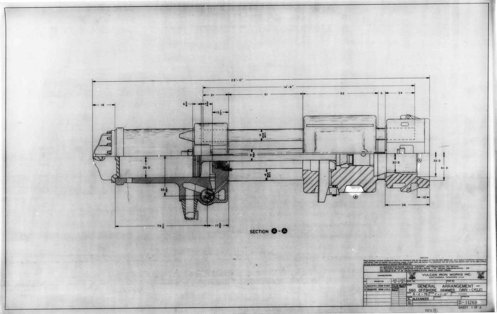 The Vulcan 560 hammer became the “#1 of Vulcan offshore hammers,” and the most popular of its offshore hammers from the 1970’s onward. Yet, although today the logic of a 5′ stroke hammer (especially when compared to the diesel hammers) is obvious, at the time it took a little persuading.