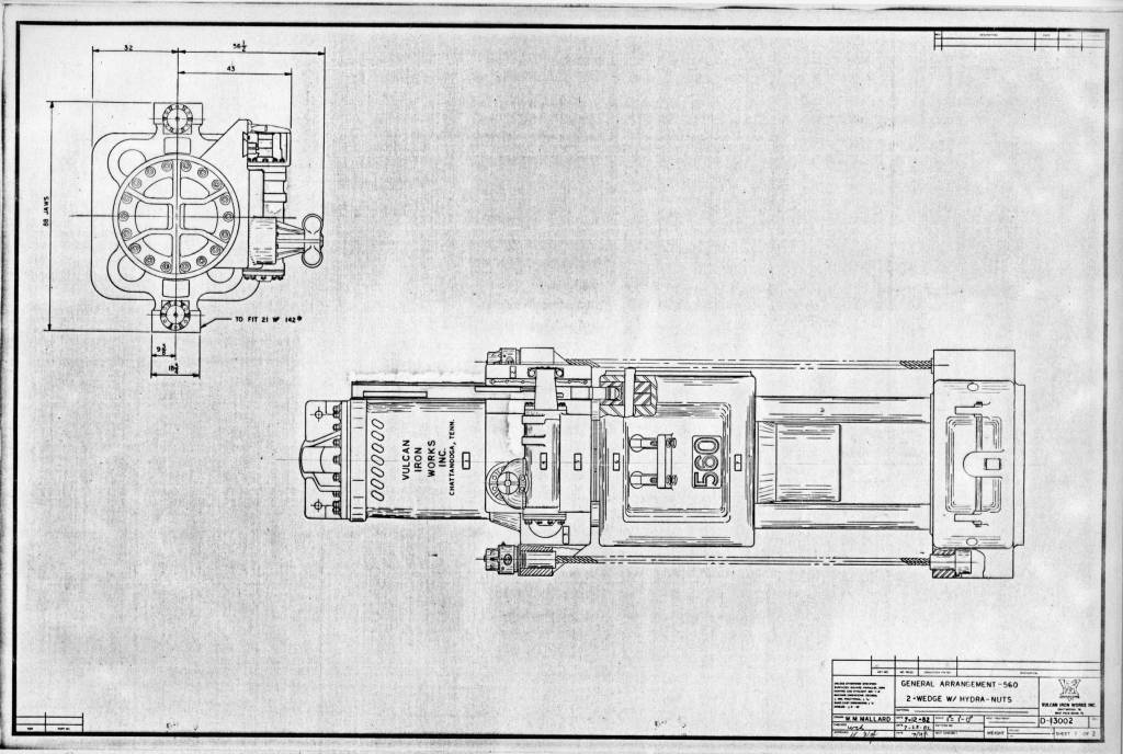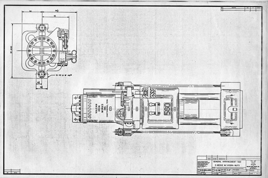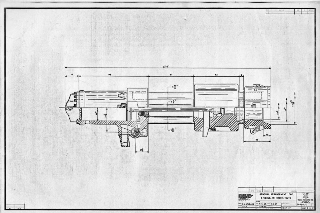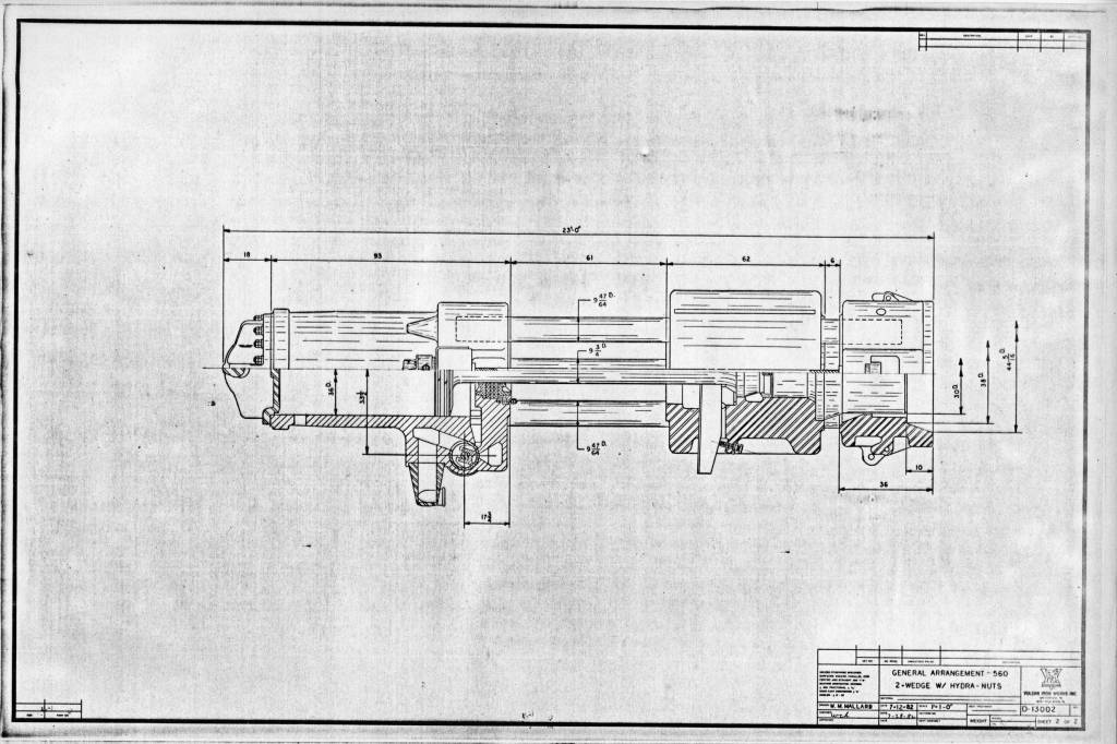 A lighter hammer would allow the contractor to drop to the secondary block on the crane, the traditional block to use for hammers. This block could raise and lower the hammer faster, and give the crane operator more control over the hammer during both lift and operation. (The mechanics of this are shown in the Appendix.) Vulcan “bit the bullet” and proposed the 560, which lowered the ram weight (and thus the frame weight) to around 30 US tons while preserving the striking energy with the 5′ stroke.