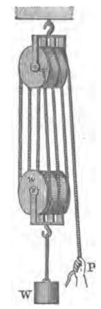 Offshore, the weight of the hammers made using a full-load line and winch impossible, thus a two block arrangement is as shown on the left and the hammer is hung off of the lower block. The explanation that follows comes in part from Smith’s Mechanic. This was the textbook that George Warrington used when he was at the University of Illinois; the edition linked to has a date of 1863.