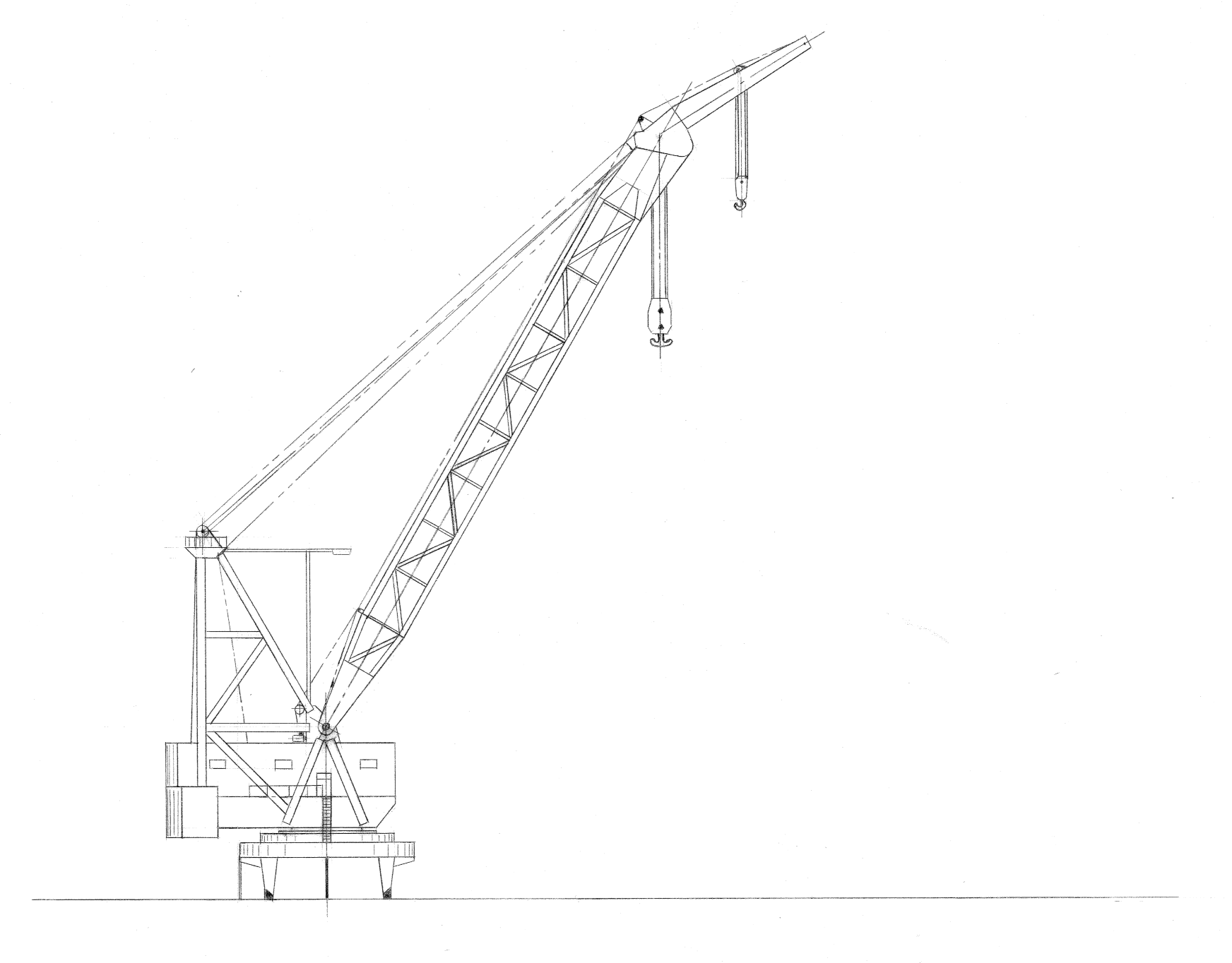 When most people think of picking up something with a crane, be it a pile hammer or anything else, they think of a single line that runs from the winch in the cab body up to the boom point (or beyond, using the example on the right.) The line turns around and connects to the load below it; the hammer (or pile, the two have separate lines in this rig) moves up or down according to which way the crane operator rotates the winch. Being a single line, if friction is neglected the line carries the entire load of the hammer or pile, and that tension load is transmitted in its entirety to the winch, which converts the load to a torque load for the winch motor.