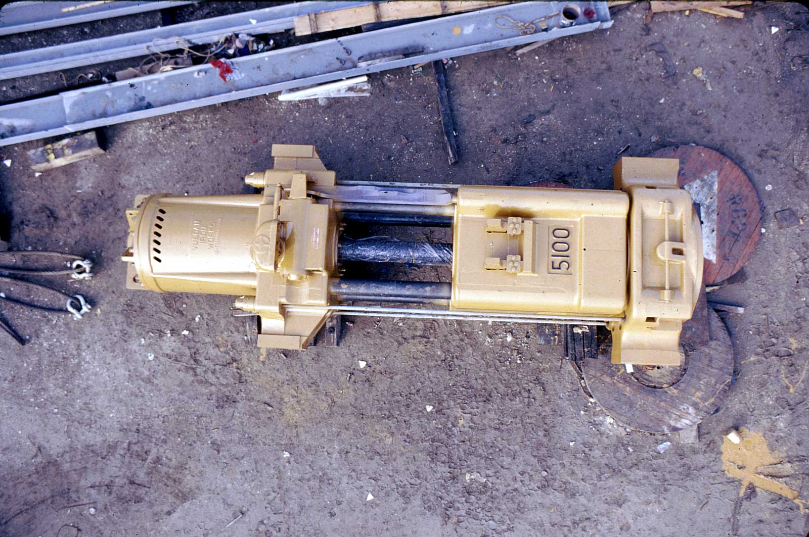 With the success of the 560 the 5′ stroke concept was taken upward with the 5100, an extension of the 3100. In addition to the longer stroke, it was Vulcan’s first hammers with 120″ jaws, to accommodate 96″ piling. The first 5100 was sold to Brown & Root (Western Hemisphere Marine, to be formal about it) in 1977 and, like the 3100, was assembled in the customer’s yard, in this case at Green’s Bayou in Houston.