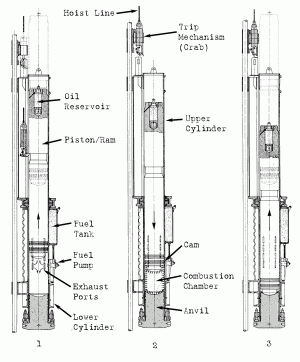 Now we come to an important topic in air trapped under the ram just before impact. When a diesel ram falls towards impact, the ports are closed and the air compresses between the ram and the anvil. The energy for this compression comes from the falling ram and is necessary for the thermodynamic cycle of the hammer. (See the diagram to the right. With an air or hydraulic hammer, the combustion thermodynamics take place in the power pack or compressor, outside of the hammer.) Nevertheless this still requires kinetic energy from the ram, and some agencies “derate” the rated single-acting energy of the diesel hammer by ~20%, which is a typical ratio of the compression energy to the rated energy of the hammer.