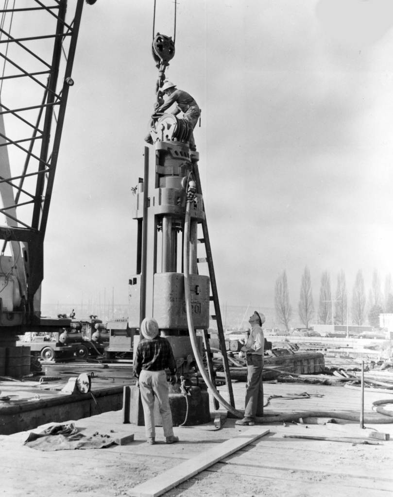 Vulcan’s enthusiasm for such an arrangement was, to say the last, restrained, even though the relative shortness of Vulcan’s hammers (relative to a diesel hammer) made such an arrangement more viable. In some cases, however, it worked and worked well. One of those cases is the one featured here, where a Vulcan 020 was used during the test pile program to drive concrete cylinder piles. The project was a connecting link for the Evergreen Point Bridge in Seattle, Washington, specifically the Portage Bay Bridge. The contractor was McCray Brothers Construction Company; the superintendent on the job was Robert Currie, the construction department manager was Ralph Finke, and the job office engineer was Sid Porter. The project cost was $2,291,805.