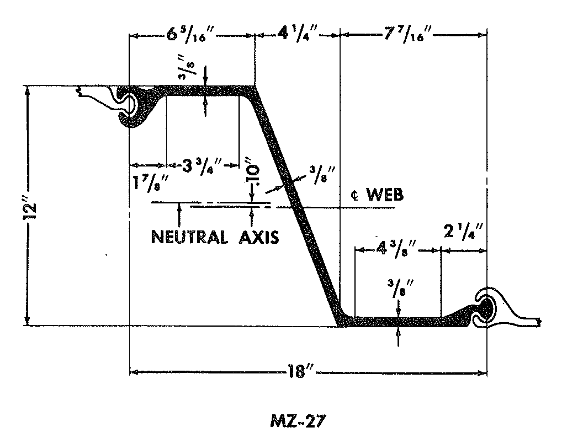 This is the classic Z-shape sheet piling, the ZP-38 section from Bethlehem Steel. Note that the different segments in the sheeting are rolled at right angles to each other. From a moment of inertia standpoint this is the most efficient way to do it, it was difficult to roll. A more conventional (and contemporary) Z-shape, the ZP-27 section from Bethlehem Steel. The centre segment is at an obtuse angle with the extreme fibre segments, which decreases the moment but makes the sheeting easier to roll and less prone to failure at the corners.The MZ-27 Section from U.S. Steel Corporation. This diagram shows the location of the neutral axis. Sheet pile is designed like a continuous beam in that the shape has a moment of inertia (and section modulus) and the extreme fibre stress sigma is simply sigma = Mc/I. Note that the neutral axis is slightly different from the centreline of the web; that’s because the interlocks induce a slight lack of symmetry in the section.One type of European Z-sheeting is the Frodingham sections, from the UK. Here two are shown; this is traditionally how they are driven, two at a time, whether by impact hammers or especially vibratory ones. The interlocks are different than their American counterparts. In earlier times this was a distinguishing difference between American and European sheeting, but now both can be seen on both sides of the Atlantic and elsewhere.A different type of sheeting is the deep arch sheeting, in this case Larssen sheeting. Originally designed by Tryggve Larssen, It has become popular in many parts of the world. One of the enduring disputes in sheet pile design is the fact that European designers consider the neutral axis at the interlocks, while American ones generally reject this. The difference is significant and explains why Larssen sheeting has not gained the acceptance in the US it has elsewhere. Related to this are deep arch sections such as this, the DP-2 section from Bethlehem Steel. In addition to the moment of inertia aspects of the design, these sections allowed some angling between the sections, as is shown on the left. This made it possible to use this sheet with curved walls.A completely different type of sheeting is the straight or flat web sheeting, in this case the MP-101 section from U.S. Steel. These are primarily used in cellular cofferdams. Instead of moment resistance the sheets transmit tension through the web and the interlocks. The fill in the cofferdam puts a hoop stress in the cofferdam wall; these sheets hold the cell together.Sort of a transition between flat web sheeting and bending type sheeting is the shallow arch section. It can be used in cellular cofferdams and walls where some moment resistance is required, but can also withstand loads along the web and interlocks.