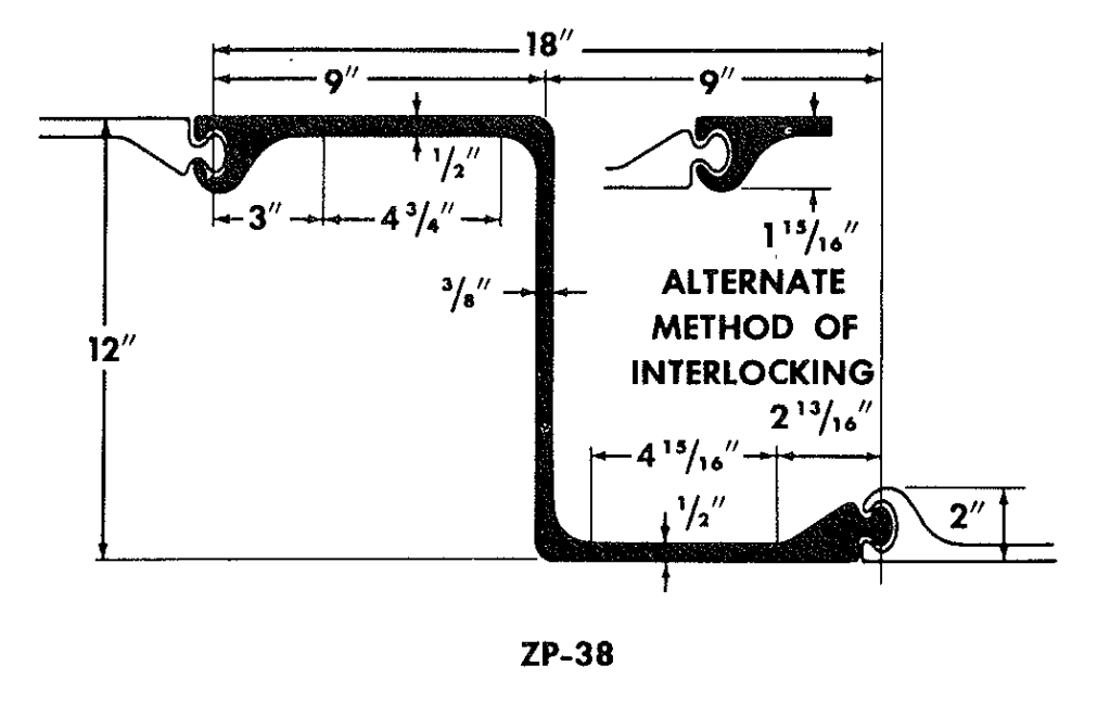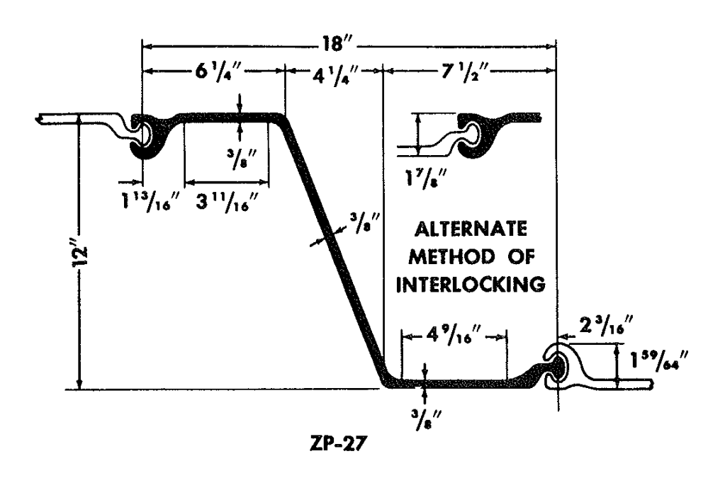 In the 1960’s Vulcan put out its Data Manual, which is now (with some improvements) in the vulcanhammer.info Guide to Pile Driving Equipment. Part of that gave dimensions for a wide variety of sheet piling. The purpose of this post is to use some of these illustrations to show various types of hot rolled sheet piling (there are many corresponding sections of cold-rolled sheeting.)