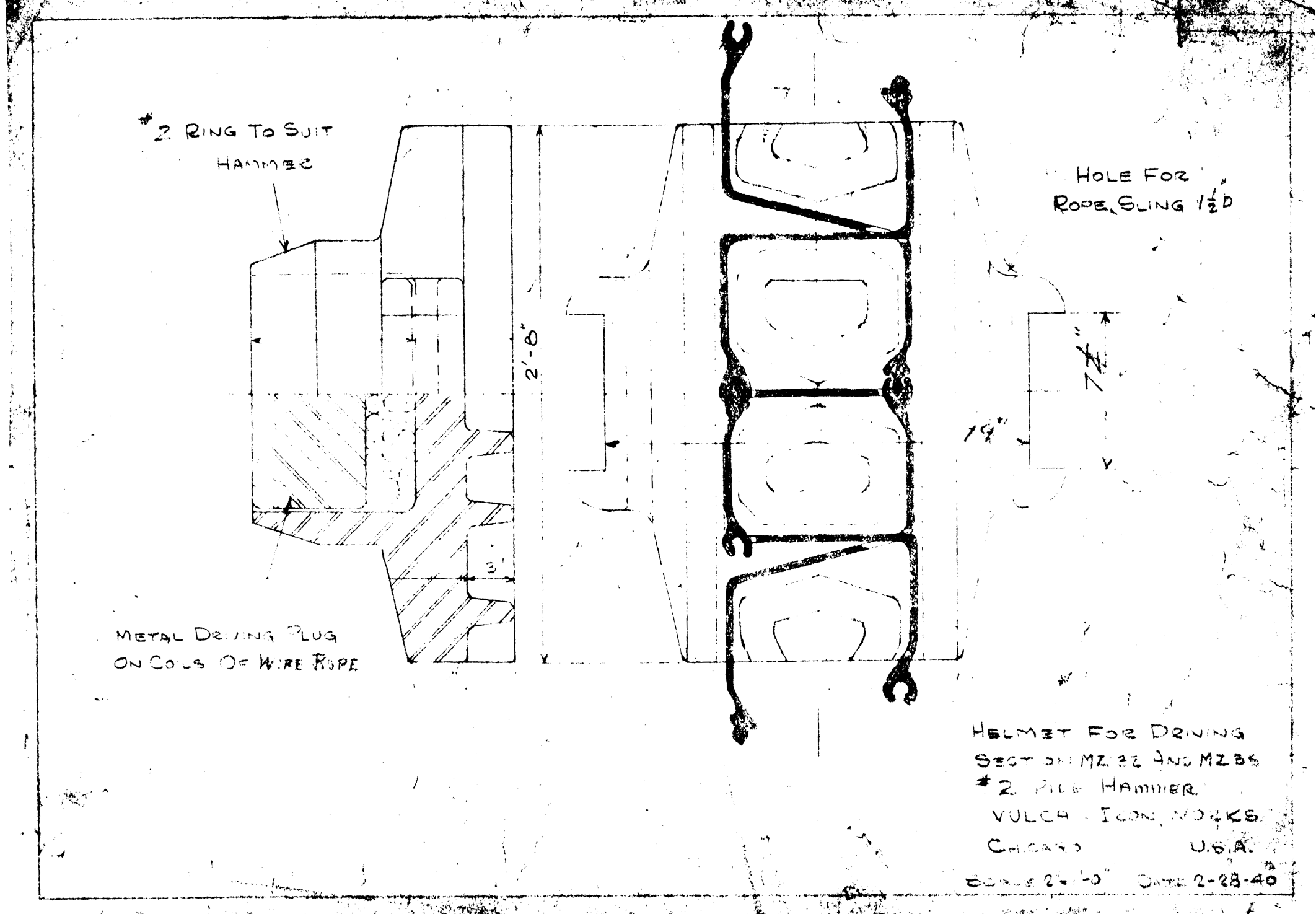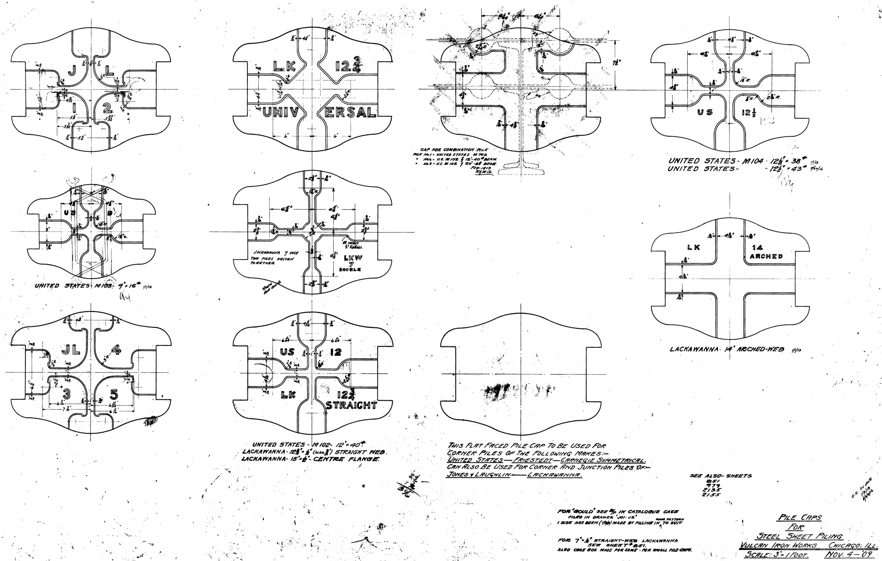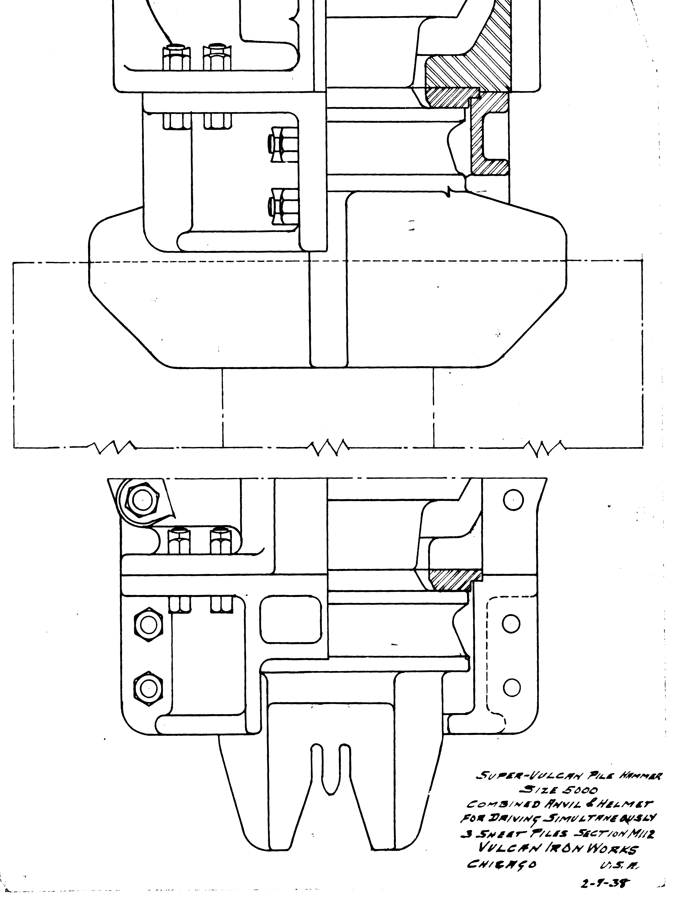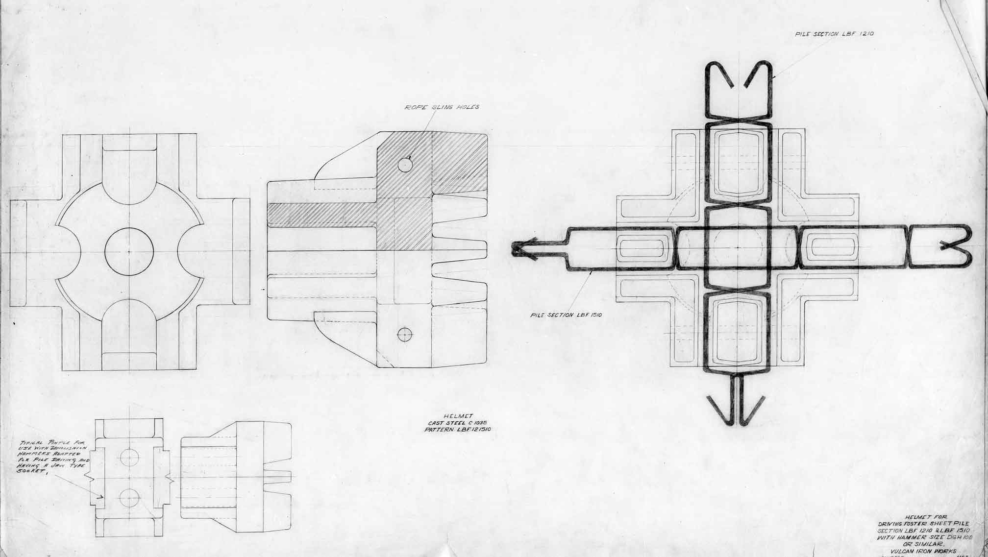 Although the classic Warrington-Vulcan and Super-Vulcan hammers were not the best suited to interface with sheeting, doing so was very common for these versatile hammers. Here are some examples broken down into two parts: the sheeting layouts and the cap configurations. These are from the years Vulcan was in Chicago, before it moved to Chattanooga in 1960.