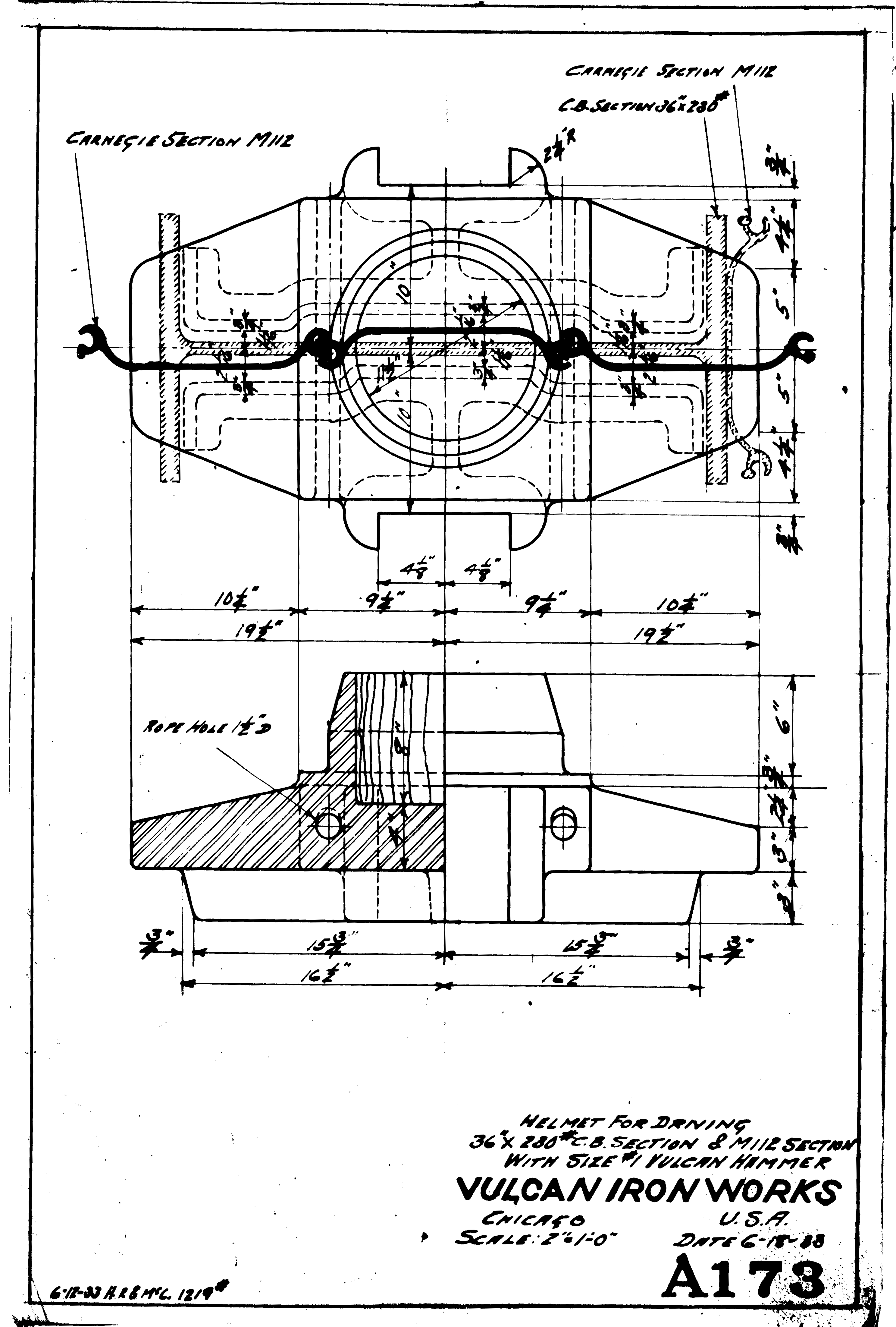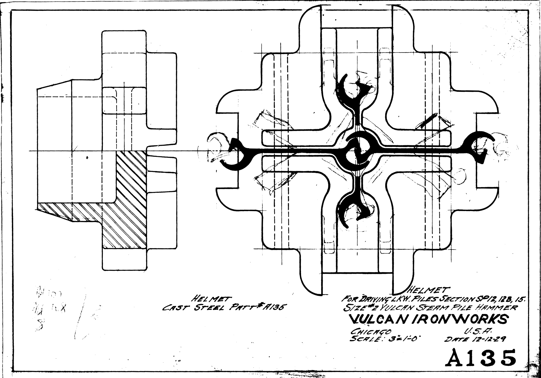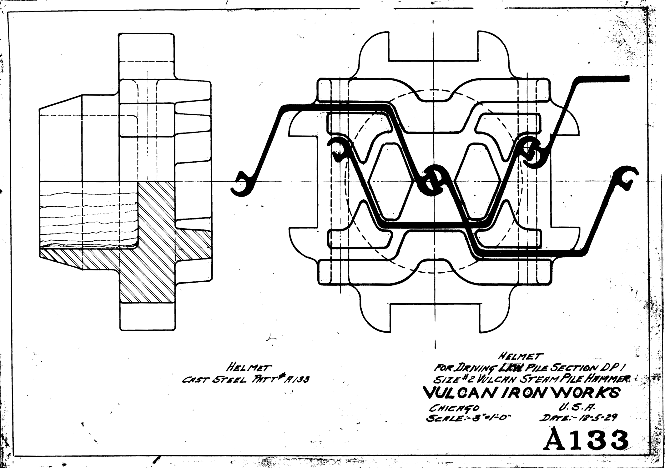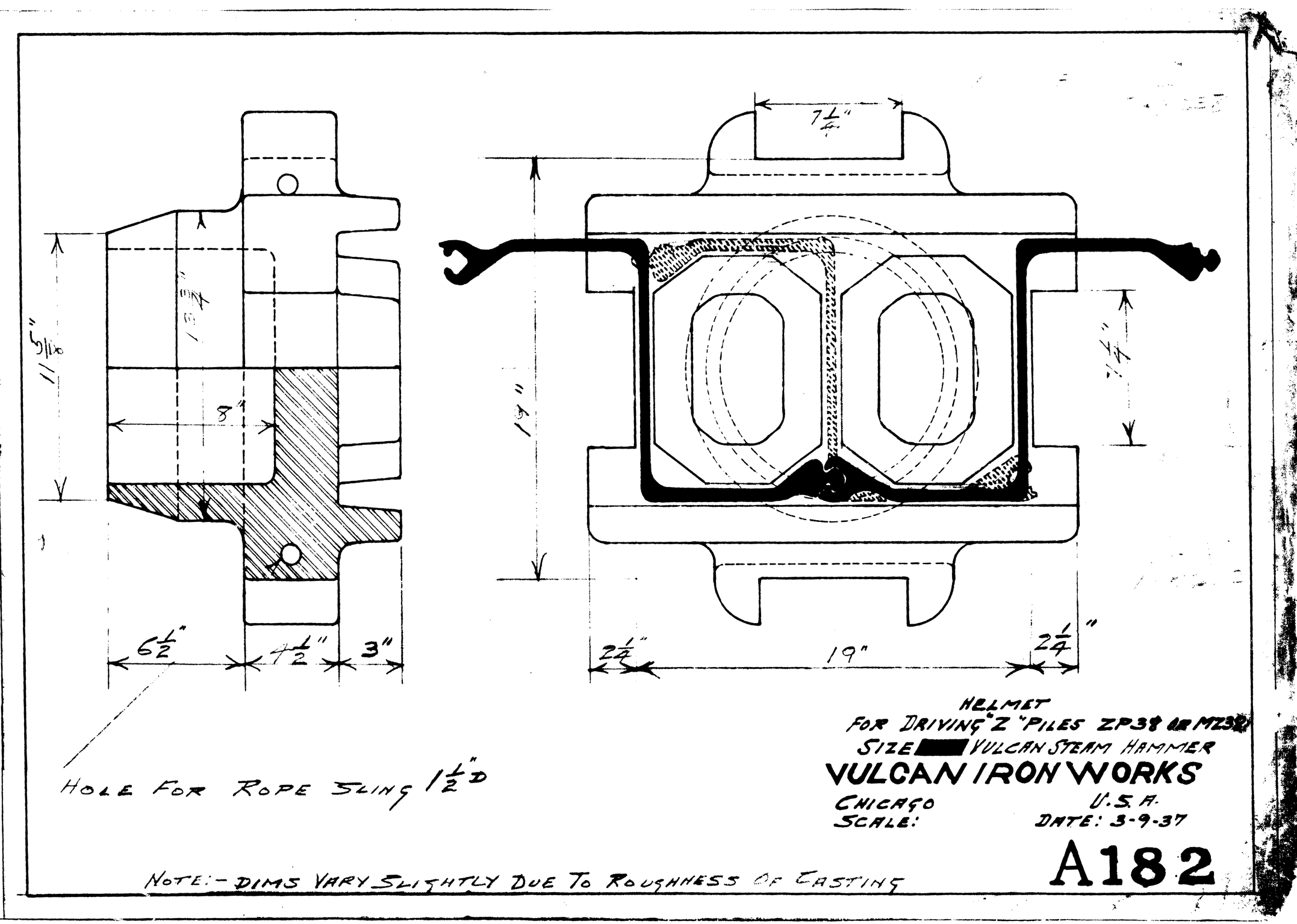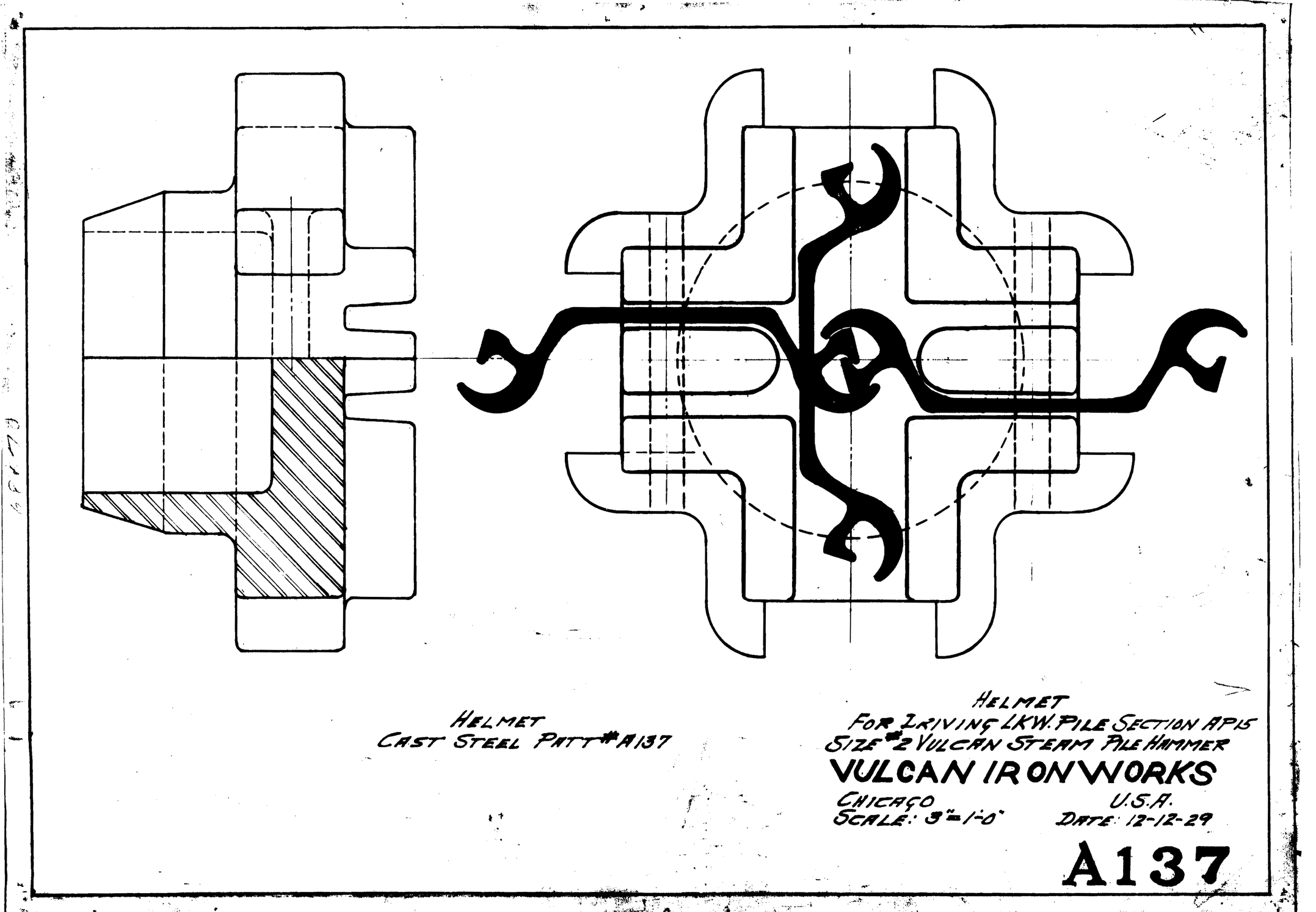 Although the classic Warrington-Vulcan and Super-Vulcan hammers were not the best suited to interface with sheeting, doing so was very common for these versatile hammers. Here are some examples broken down into two parts: the sheeting layouts and the cap configurations. These are from the years Vulcan was in Chicago, before it moved to Chattanooga in 1960.