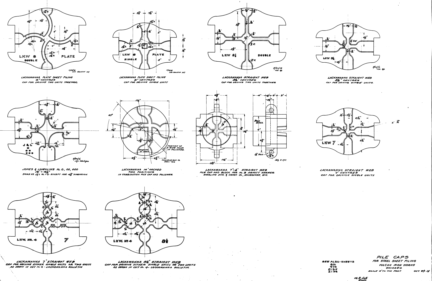 Although the classic Warrington-Vulcan and Super-Vulcan hammers were not the best suited to interface with sheeting, doing so was very common for these versatile hammers. Here are some examples broken down into two parts: the sheeting layouts and the cap configurations. These are from the years Vulcan was in Chicago, before it moved to Chattanooga in 1960.