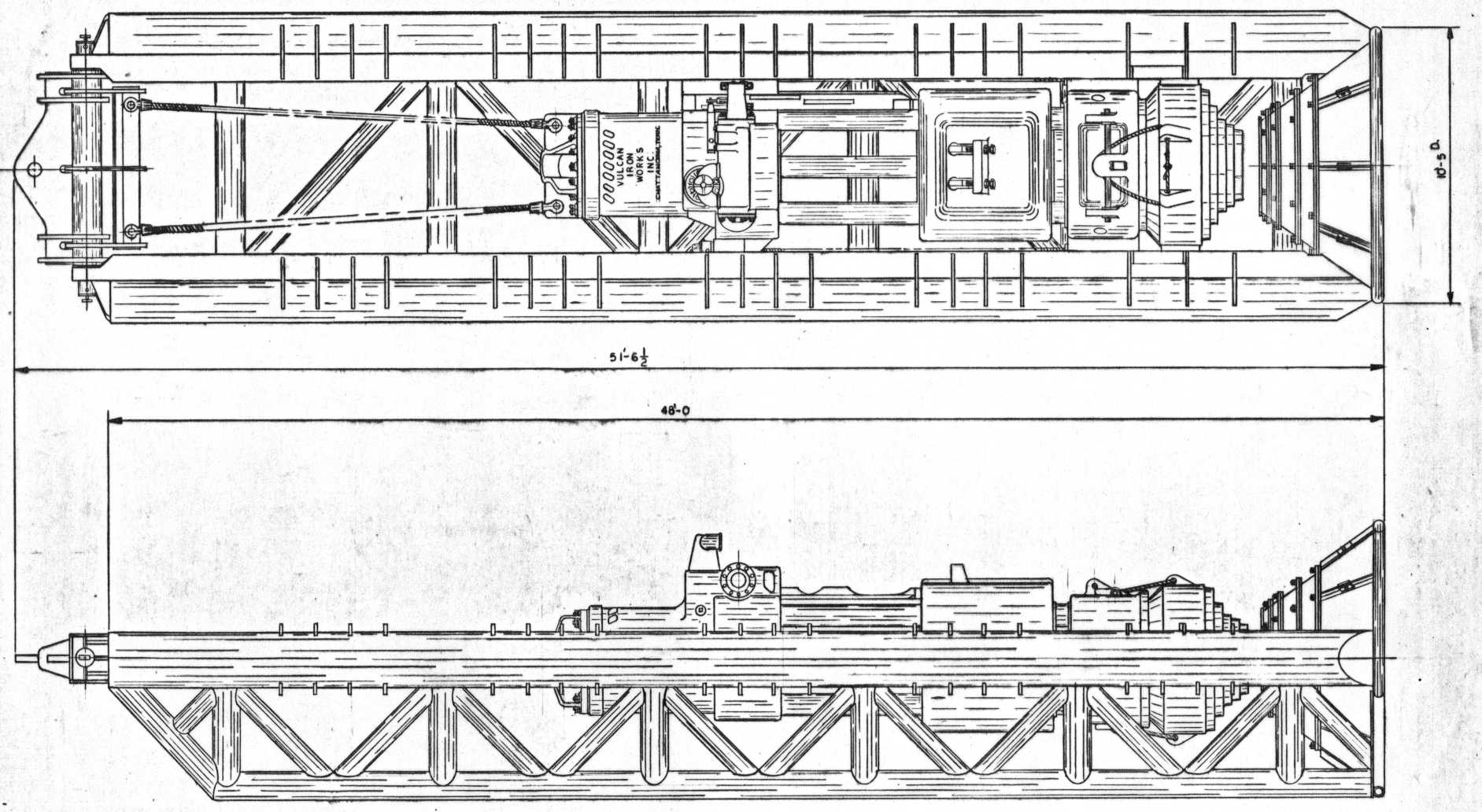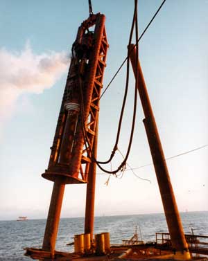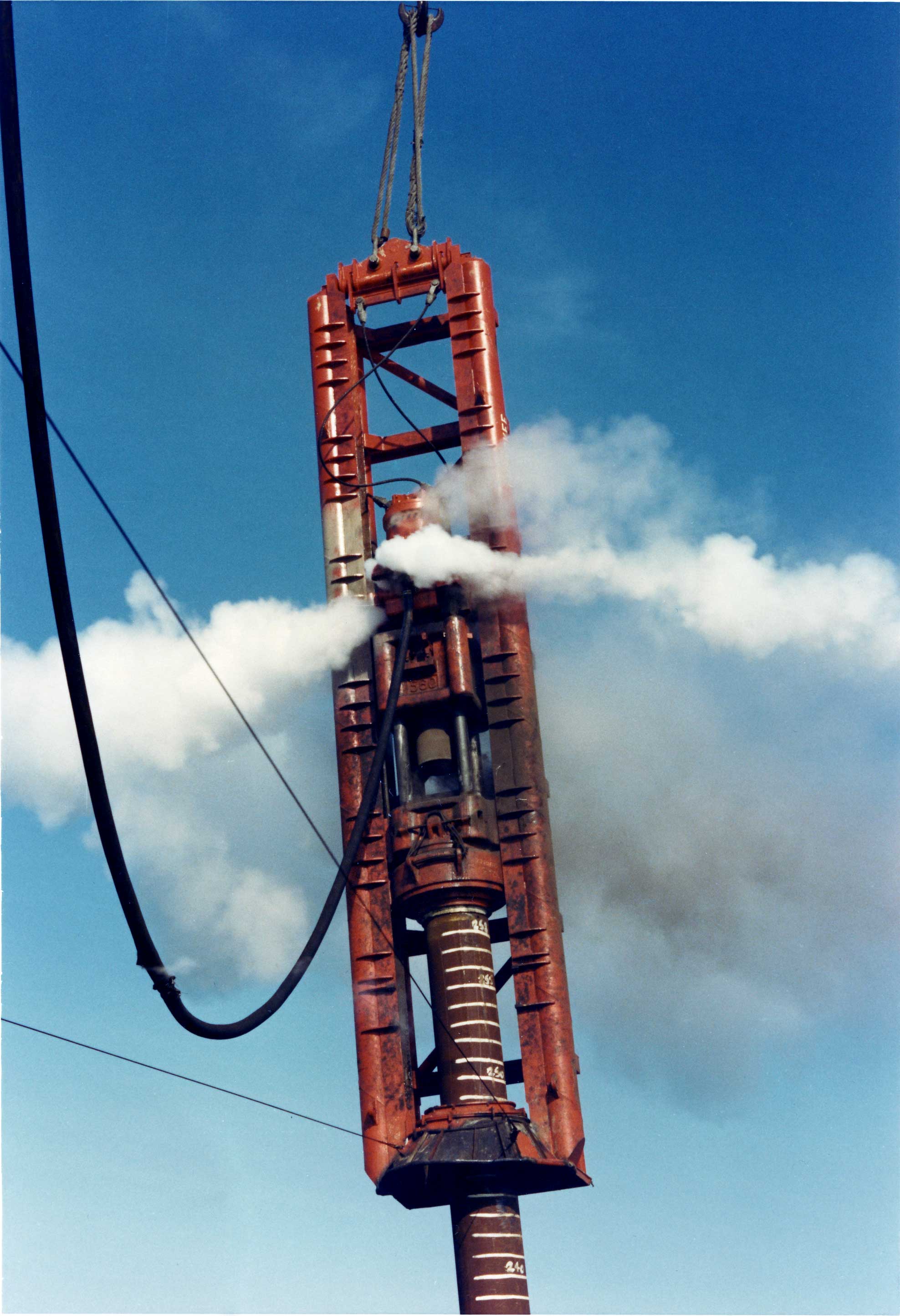 Any piece of construction equipment has to be picked up to be used, and picked up on a repeated basis. To do this requires lifting eyes, which in turn mate to either shackles or cable fittings. A good example of this from Vulcan’s product line can be seen above. You can see the two cables on the upper left extending from the leaders to the hammer. When the assembly is vertical, getting ready for operation, the cables prevent the hammer from falling through the conical stabbing bell at the right/bottom of the leaders. When the piles comes through that cone, the weight is relieved and the pile supports the hammer. At the end of driving the assembly is lifted and the weight goes back on the cables. (A more detailed description of this type of leader is here.) Some photos of this are below.