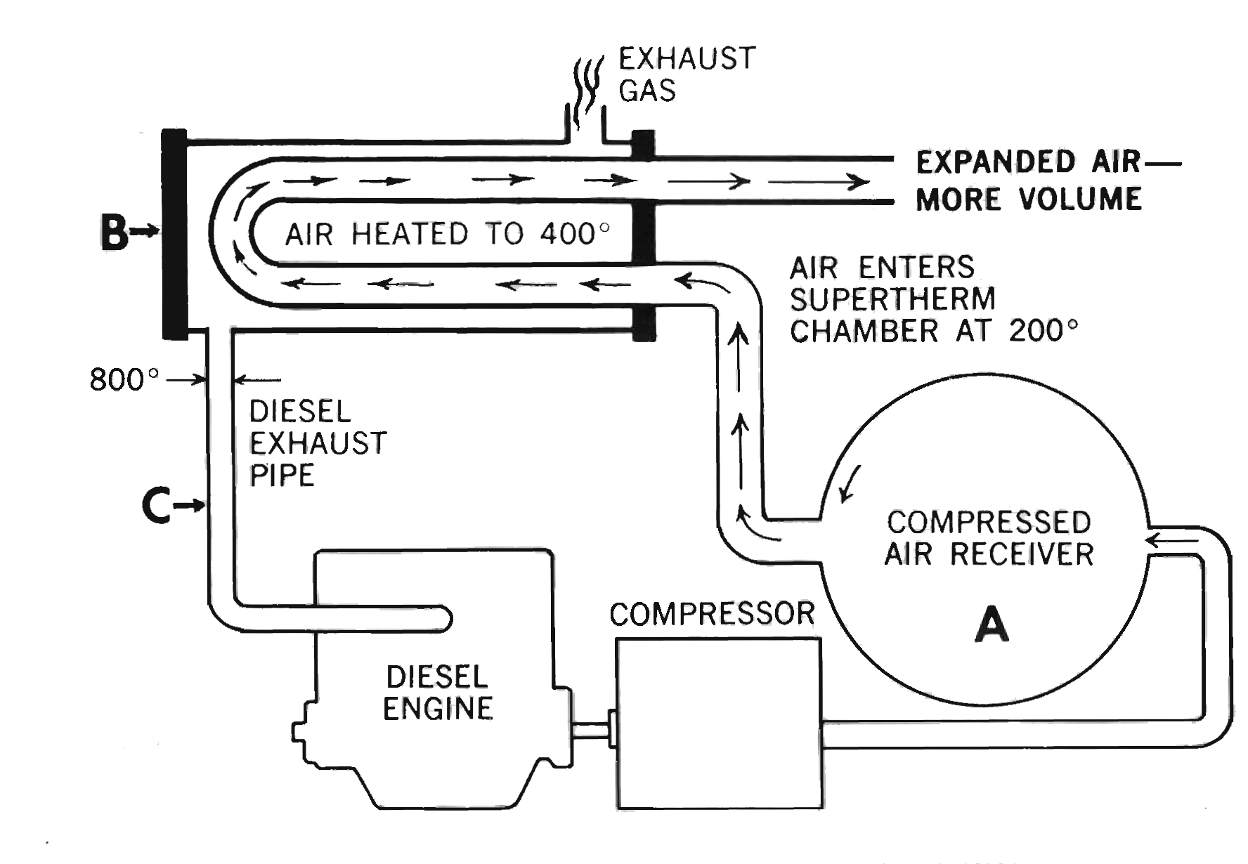 Although the unit worked as intended and performed well, the simple concept didn’t translate into a simple design. With numerous parts and complex fabrication and assembly, the unit was uneconomical to produce and difficult to install. Air compressor manufacturers learned how to use hot exhaust gases in other ways to improve the energy efficiency of their products.