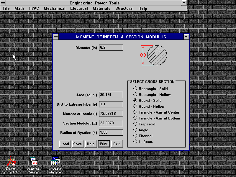 In checking their analysis we will make the same basic assumptions. To determine the bending properties of the shaft we used Engineering Power Tools in all its Windows 3.1 glory, ignoring the fact that the results are supposed to be in inches (any consistent units will do):