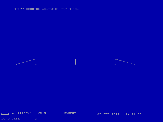 The moment at the midpoint of the shaft is 98,590 N-cm, which varies significantly from the (48500)(9.81) = 475,785 N-cm in the hand calculations. The problem is that there is a math error in the computation of the reactions at the bearing. Looking at the results (at the end of the post,) the reactions should be 64,750 N instead of the (4125)(9.81) = 40,466 N-cm shown. However, if you actually perform the math in the original post, you get (6600)(9.81) = 64,746 N-cm, which is essentially the same as CFRAME. This error was carried over to the moment at Node 3, where the hand calculations, if corrected, would result in (1500)(9.81) = 14,715 N-cm, which is not the same as CFRAME but much closer than the original result.
