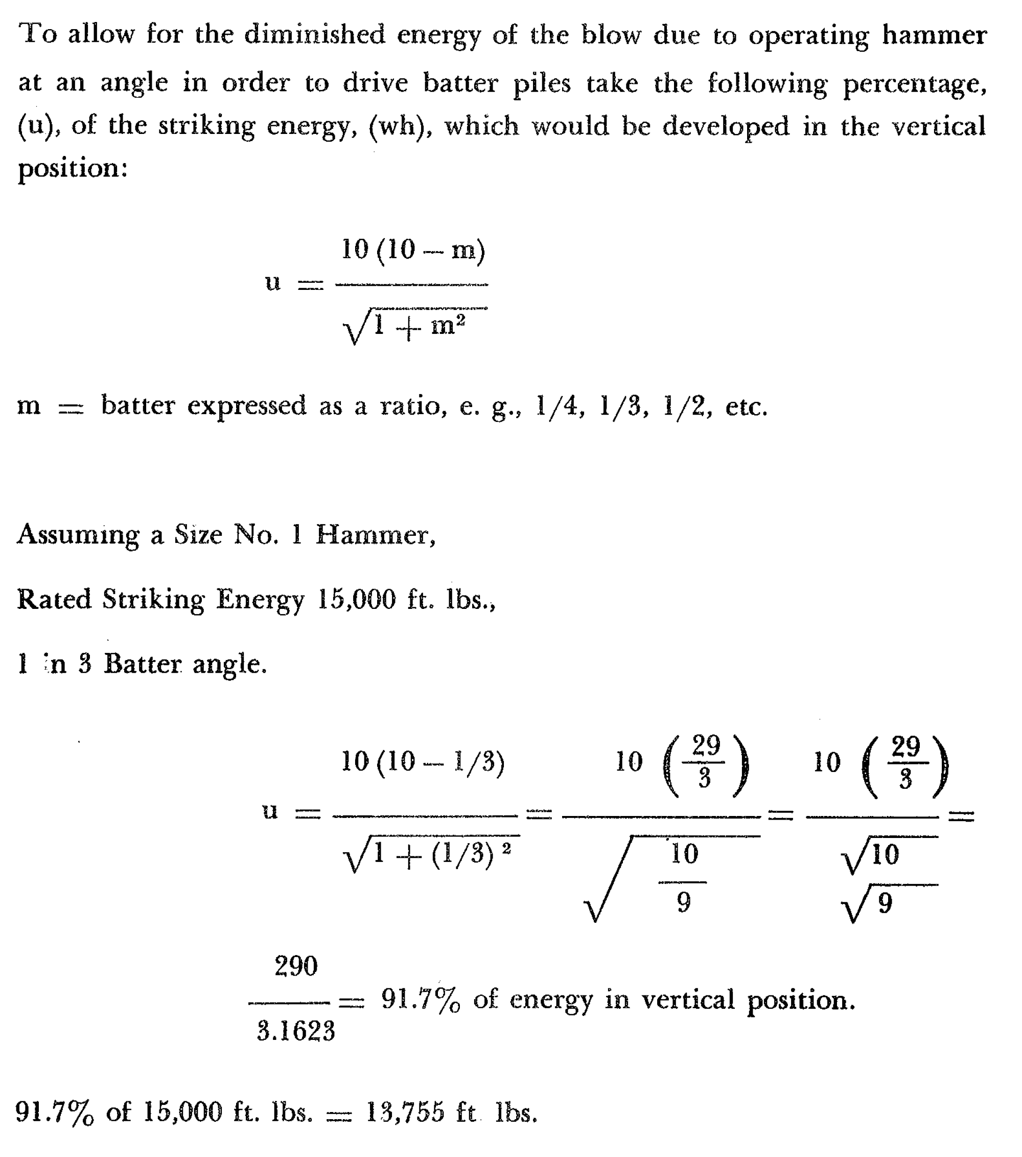 There are two significant differences between this formula and the one we derived. The first is that Vulcan incorporated “an assumed friction between leaders and hammer of 10%.” (What the friction between the leaders and the hammer has to do with this is hard to know, although keeping leaders greased during operation is important.) In any case this translates into a coefficient of friction f = 0.1. The second is that Vulcan’s formula expresses the portion of “plumb energy” as a percentage.