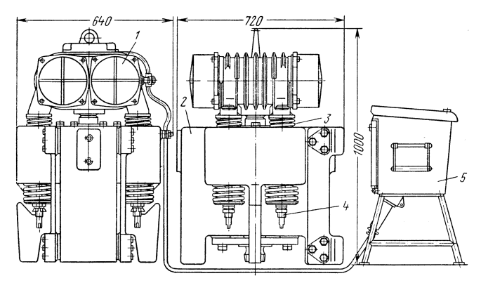 Figure 15. Structure of the vibratory hammer S-402A: 1 – ram; 2 – head; 3 – spring; 4 – rod; 5 – control panel