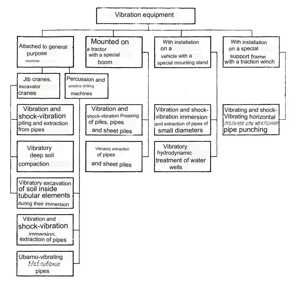Figure 2 shows the variants of aggregation of vibration equipment with various basic machines and mechanisms of general purpose or special ones, worked out by many years of practice, which allow to realize the advantages of vibration technology to the greatest extent in the production of a number of construction works. By means of vibration technology, complex technical problems are solved using general-purpose mechanisms (cranes, drilling rigs,) simple auxiliary devices (support frames for winches) or cars and tractors with the appropriate equipment. Simple equipment with simple methods of organizing the production of work due to vibration becomes competitive in comparison with rather complex non-vibration installations, and in some cases surpasses them in terms of its indicators (labor productivity, reduction in the cost of work.)