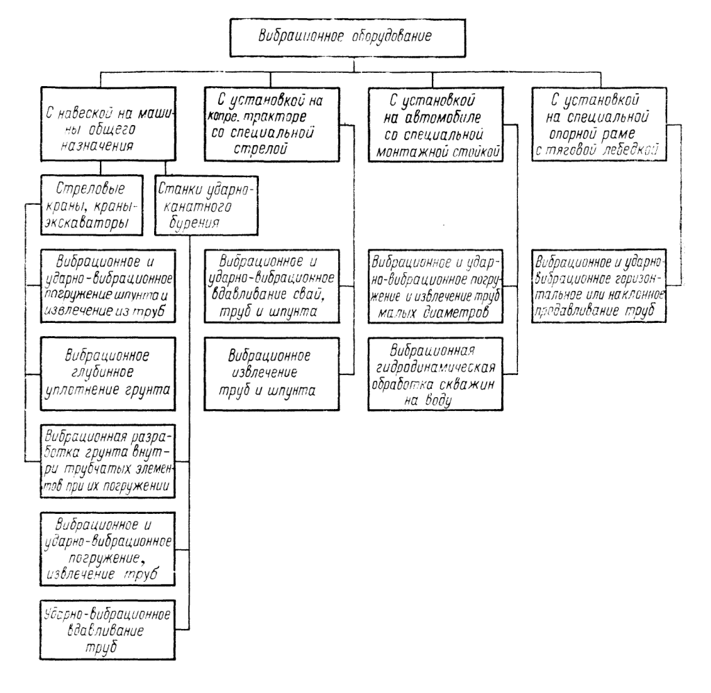 Table 1 lists the types of work in which the use of vibration technology provides advantages over the traditional one when using certain structural elements or working bodies. The effective implementation of vibration technology in each specific type of work requires the use of not only vibration equipment, but also the appropriate lifting and auxiliary equipment, which ensures the complexity of solving a specific production problem. So, when performing work on immersion (extraction) of sheet piles and shell piles, on the installation of stuffed piles, etc., in many cases, to achieve such complexity, it is sufficient to use general-purpose jib cranes equipped with a vibration isolation system. For a number of other works (driving individual pile clusters, drilling engineering-geological wells, development and repair of water supply wells, trenchless laying of pipelines), it is advisable to use effective, technologically convenient vibration means as part of fairly simple special-purpose units. The works of VNIIGS, Orgenergostroy, TsNIIS, PNIIS created units that are widely used in construction.